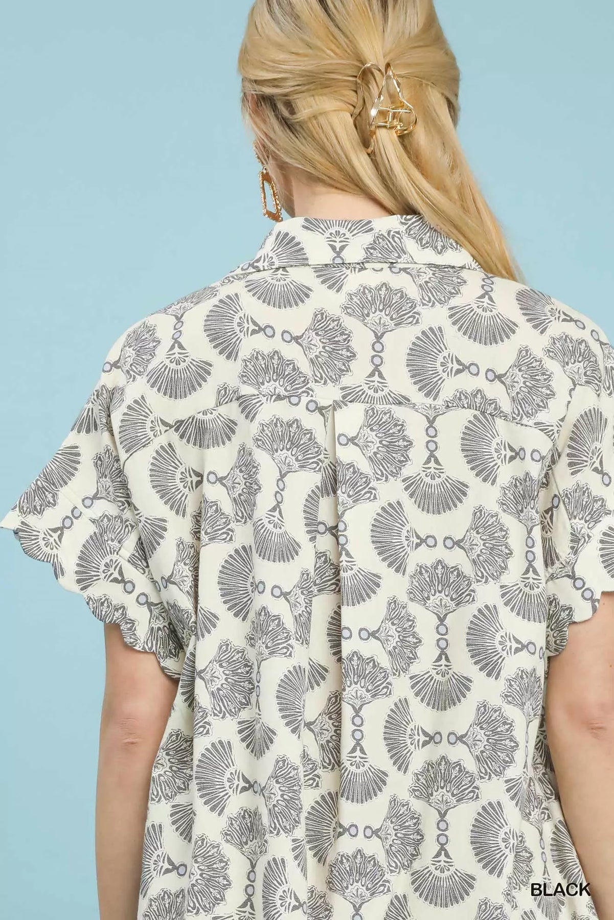 The Printed Button Front Shirt Dress is a versatile and stylish piece that features a collared neckline for a classic and polished look. With short flutter sleeves, this dress adds a touch of femininity and movement to your outfit. Scalloped details on the dress offer a unique and eye-catching design element. Although not lined, this dress is lightweight and perfect for warm weather styling. Elevate your wardrobe with this chic shirt dress that exudes effortless style and sophistication.