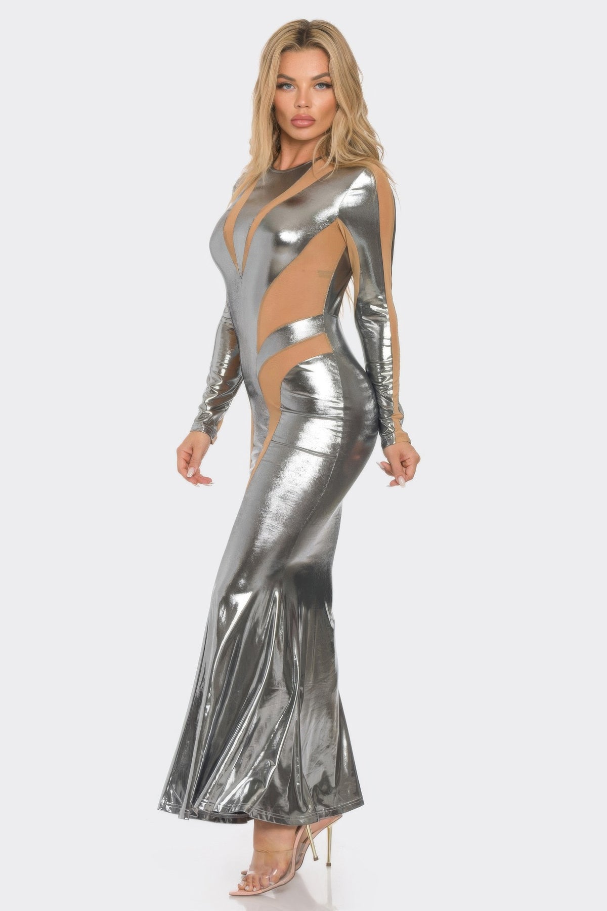 Dramatic and daring, this mesh cut-out detail maxi dress brings bold elegance to any evening look. Designed with long sleeves and a body-contouring fit, it features sheer mesh paneling and striking cut-outs that elevate its sultry appeal. The flared hemline adds graceful movement, while the metallic finish gives it a luminous edge. Crafted from a stretch-infused polyester blend, this piece is made to move with you while maintaining a sleek, structured silhouette. Perfect for upscale nights out or statement occasions, this dress is a true showstopper.