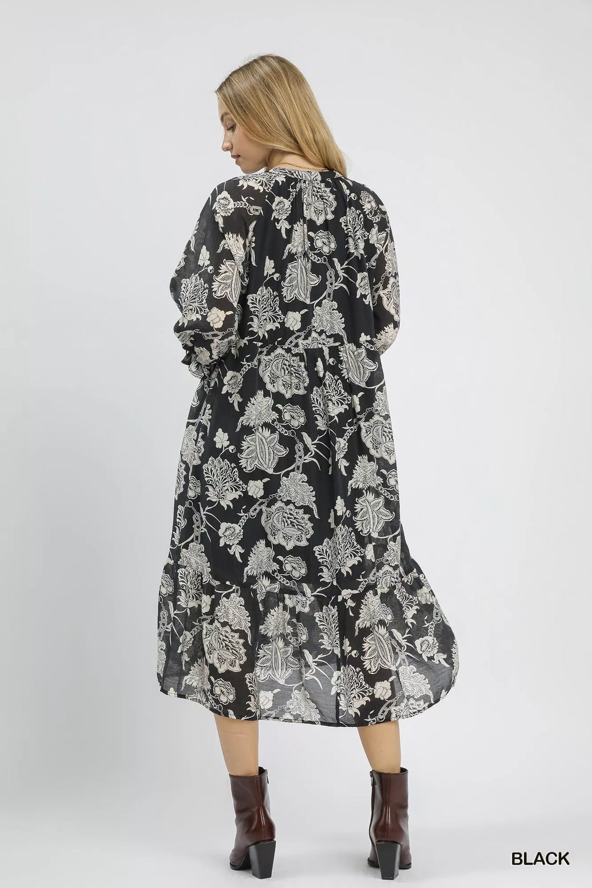 This floral print boho midi dress exudes a charming and romantic vibe. The feminine floral pattern adds a whimsical touch to the design. With a midi length, this dress offers a versatile and easy-to-wear style. Perfect for a bohemian-inspired look, the dress features a relaxed and flowy silhouette. Ideal for both casual and dressed-up occasions, this dress is a lovely addition to your wardrobe.