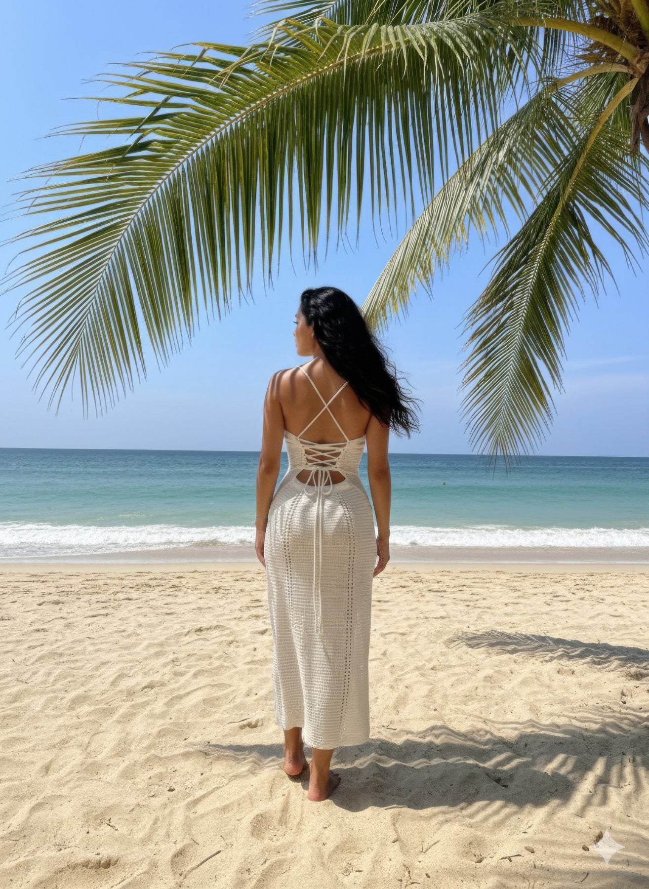 Make a graceful statement in the Halter Neck Crochet Maxi Beach Dress, a flowing cover-up designed to elevate your beachside wardrobe. Made from 100% viscose, this lightweight and breathable piece features intricate crochet detailing and a flattering halter neckline that ties for an adjustable fit. The full-length silhouette adds elegance while allowing your swimwear to subtly show through. Ideal for poolside lounging, tropical vacations, or seaside dinners, this dress blends relaxed comfort with effortless sophistication.