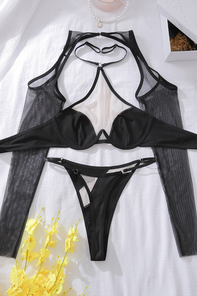 Elevate your intimate wardrobe with this sultry three-piece set designed to turn heads. The sheer mesh construction features a wired halter top that offers flattering support, paired with a matching thong for a seamless silhouette. The long-sleeve cover-up adds an alluring layer of mystery, perfect for transitioning from bedroom to beyond. Crafted for confidence, this set combines bold style with undeniable appeal—ideal for special occasions or everyday indulgence.