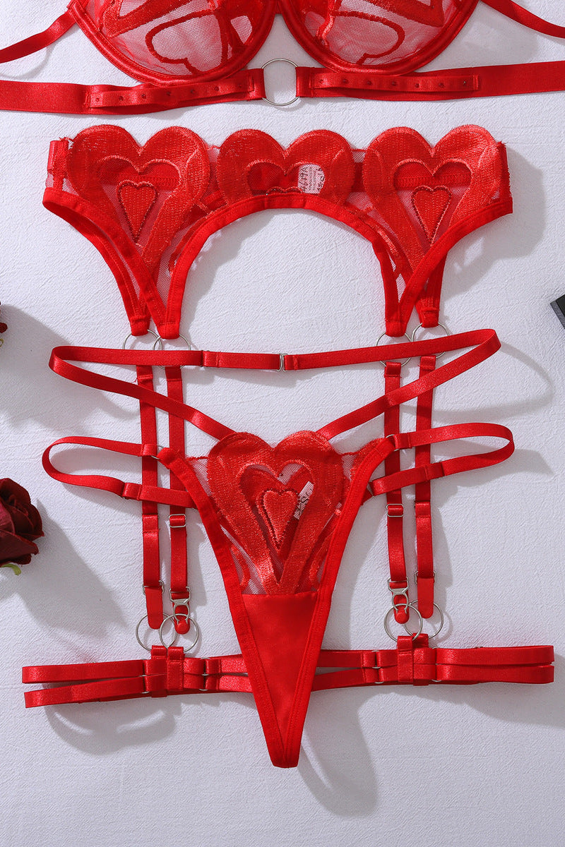 Red Heart Shaped Lace Mesh Bra Thong Garter Belt Sexy 5Pc Lingerie Set