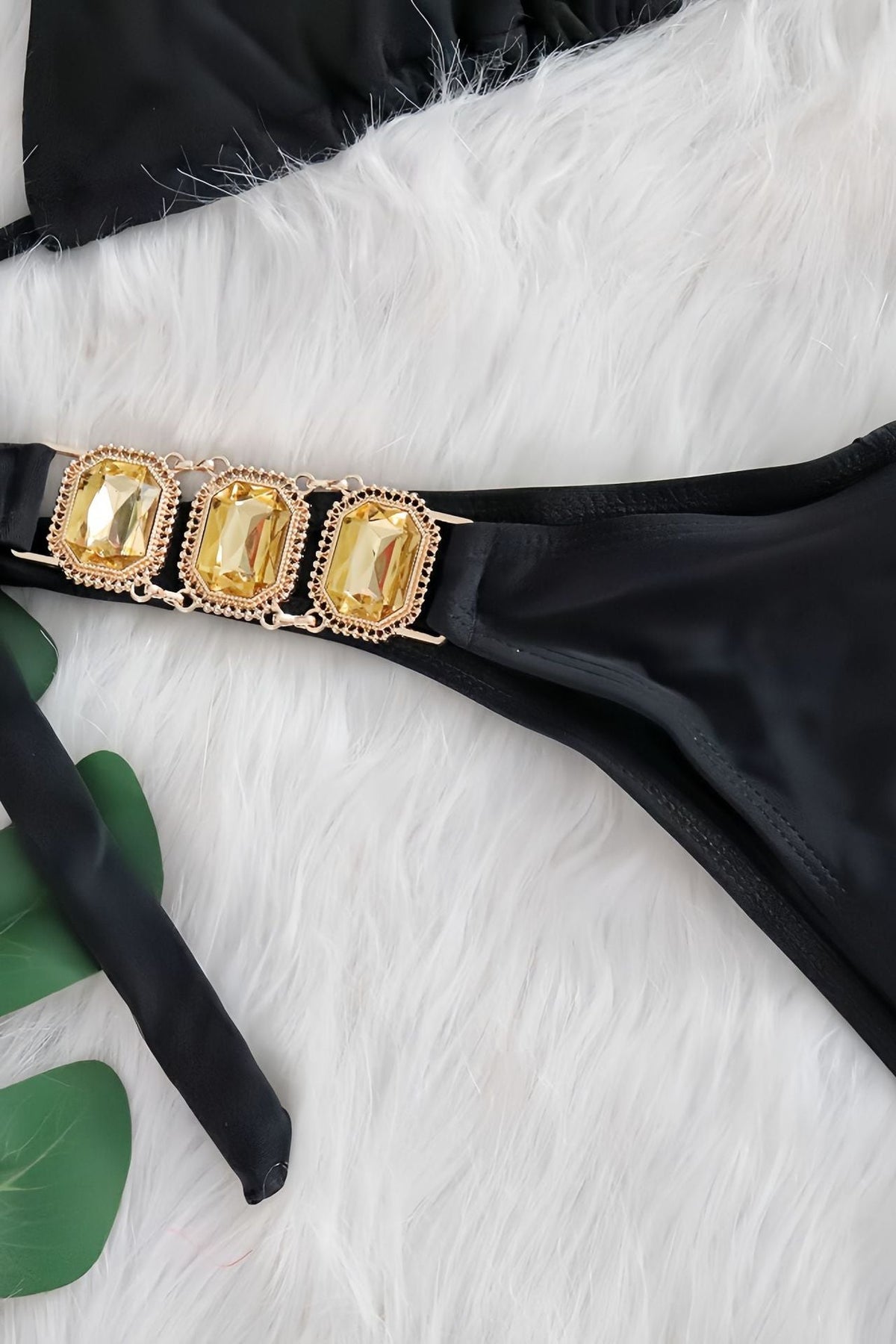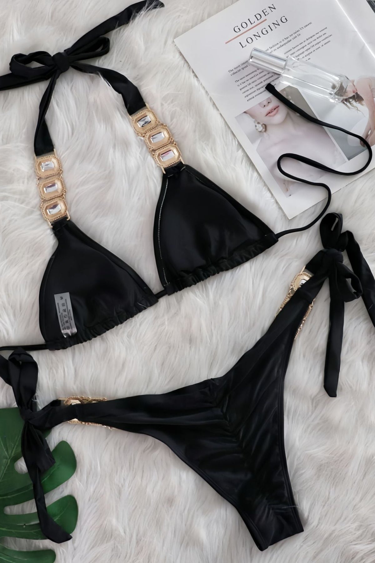 Make a statement at the beach or pool in this stunning two-piece bikini set. The halter top features eye-catching rhinestone gem detailing that catches the light with every move. A ruched back design adds flattering dimension and texture, while the cheeky cut delivers a bold, confident silhouette. The black base keeps the look sleek and versatile, letting the sparkle take center stage. Perfect for those who want to turn heads and feel fabulous.