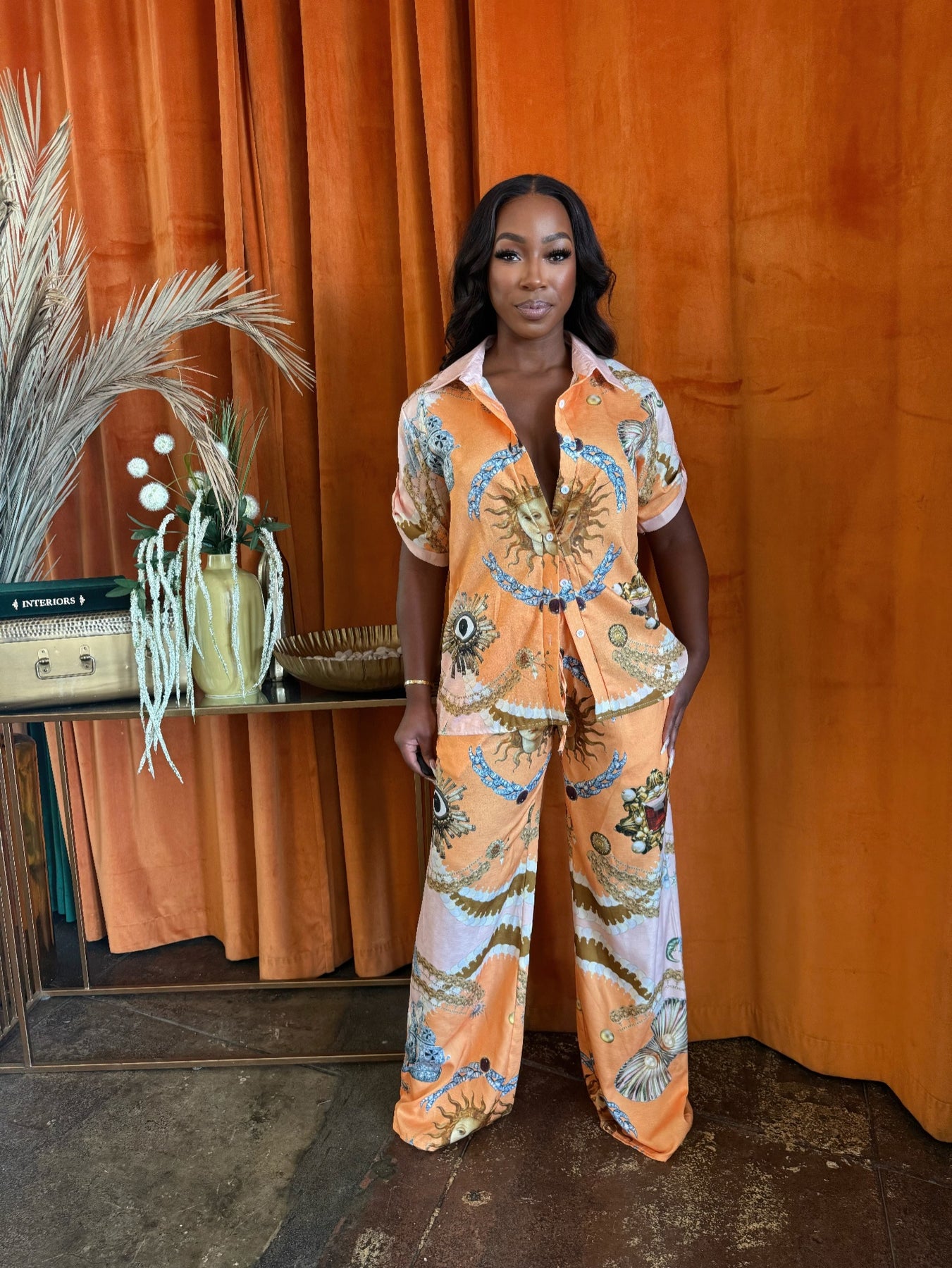 The Solar Muse Pants Set channels effortless resort elegance with a vibrant twist. Crafted from silky, lightweight fabric, this two-piece ensemble features a short-sleeve button-down top paired with wide-leg pants for a breezy, coordinated look. The radiant sun and seashell motifs add celestial charm, while the bold orange base makes a confident style statement. With its luxurious drape and relaxed silhouette, this set transitions seamlessly from sunny days to moonlit evenings. Wear it together or mix and match for versatile, vacation-ready styling.
