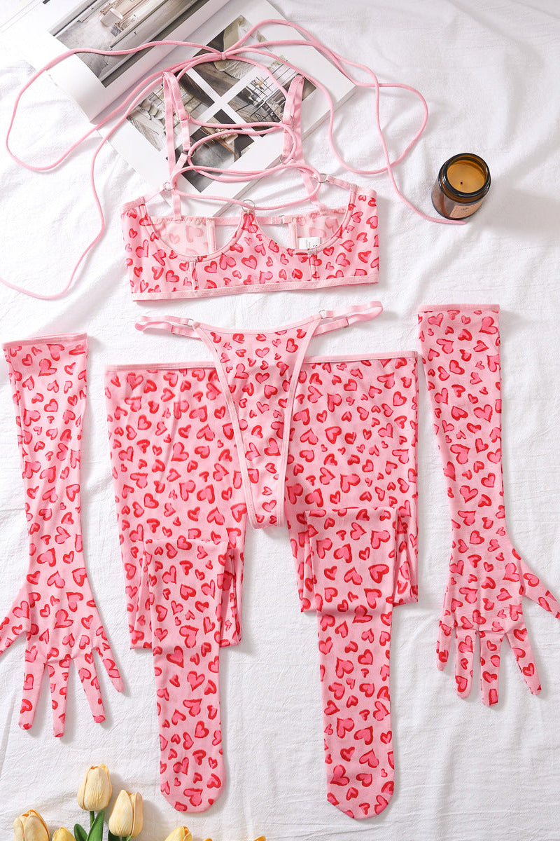 Unleash your wild side with this stunning 6-piece lingerie set featuring bold pink leopard print throughout. The mesh wired top provides flattering support with an alluring open chest design, while coordinating gloved stockings add an extra touch of sass. This complete ensemble delivers head-to-toe confidence and undeniable appeal. Perfect for special occasions or everyday indulgence, this set combines comfort with serious style. Embrace your inner feline and make a statement that's impossible to ignore.