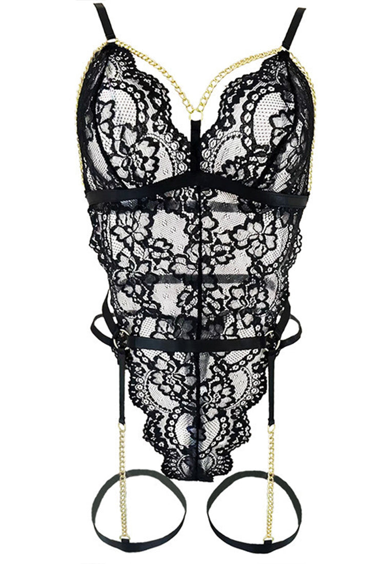 Black Lace Gold Chain Thong Bodysuit Garter Belt Sexy 2Pc Lingerie Set