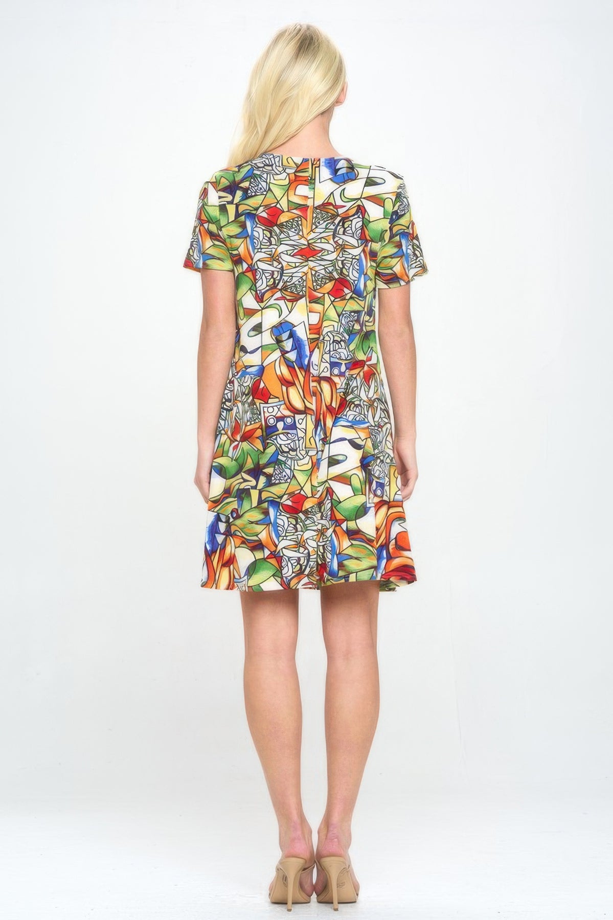 Designed for both comfort and confidence, this short-sleeved knee-length dress is a modern essential with timeless appeal. The wrinkle-resistant, stretchable fabric offers all-day ease and effortless movement. With a flattering silhouette and vibrant print, this dress stands out while remaining easy to wear. Each piece features unique print placement, ensuring your look is one-of-a-kind. Made in the USA, it's a go-to piece for everything from weekday errands to weekend brunches.