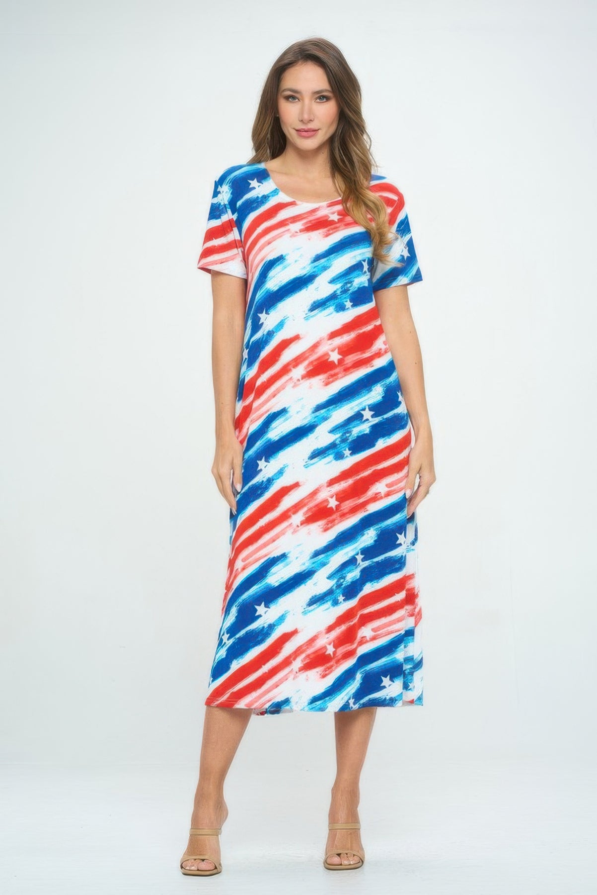 Designed for warm-weather ease, this printed long dress features a soft scoop neckline and relaxed short sleeves. The breathable fabric resists wrinkles, making it ideal for packing or busy days on the go. Every piece showcases a unique print, adding individuality to each outfit. With its flowing fit and effortless style, it’s a must-have for your everyday rotation. Made in the USA for quality you can trust.