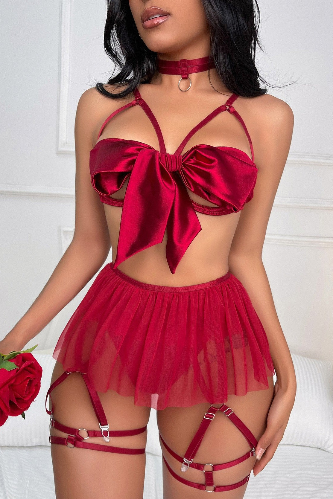 Unleash your inner showstopper with this daring red lingerie set that's equal parts sultry and fun. Featuring a wired cut-out bra with playful bow details, matching thong, and a flirty tutu skirt paired with a classic garter belt, this ensemble delivers head-turning style for special occasions or everyday confidence. The strategic cut-outs add an edgy touch while the structured wiring ensures a flattering fit. Perfect for anyone ready to make a bold statement.