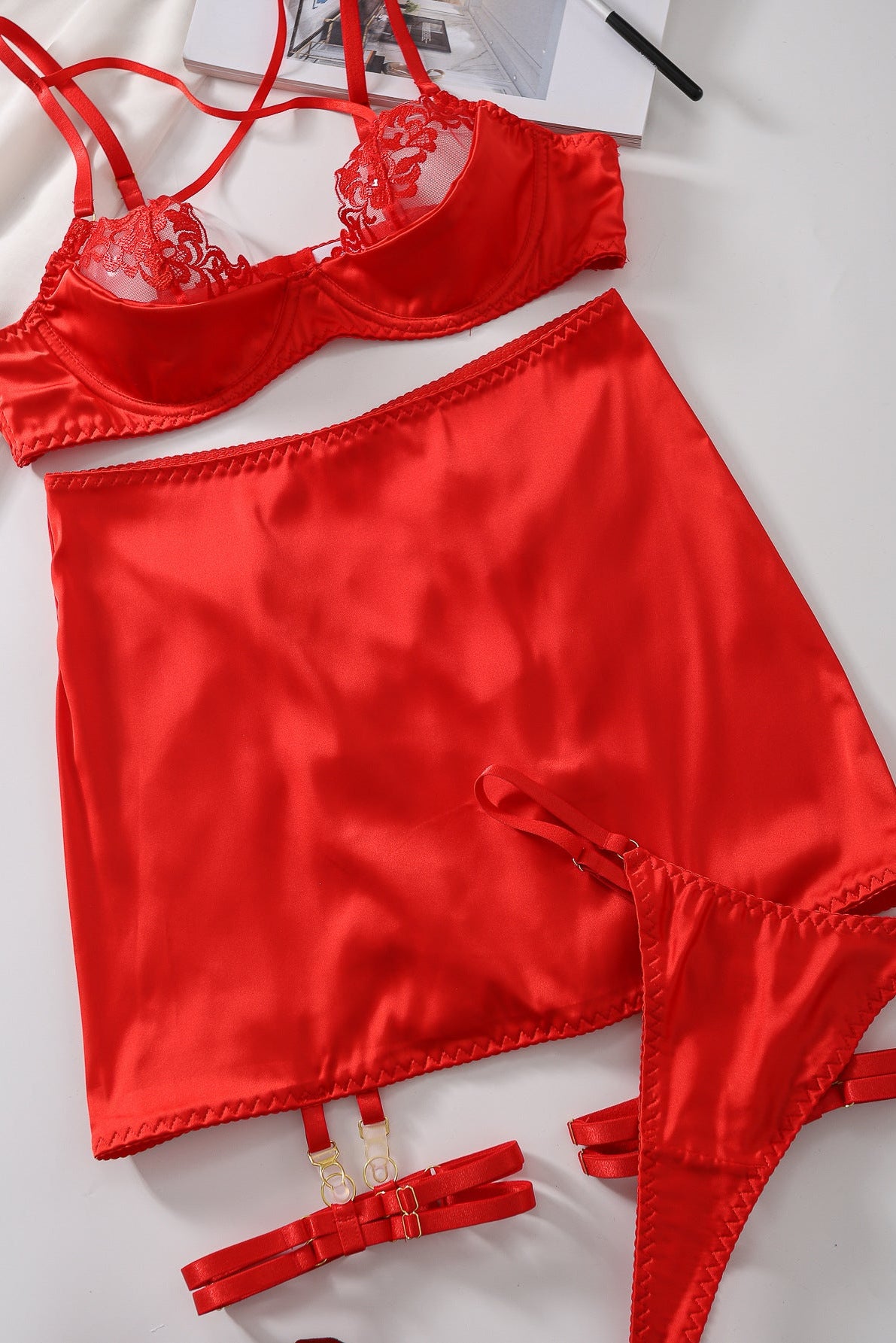 Elevate your intimate wardrobe with this stunning red satin lingerie set. Featuring a wired half cup design that flatters and supports, paired with delicate lace detailing for timeless elegance. The set includes a coordinating thong, garters, and an open back skirt for a complete look that transitions seamlessly from bedroom to special occasions. Luxurious satin fabric feels silky against skin while the structured wiring provides comfort and confidence. Perfect for date nights or adding a touch of sophistication to your collection.