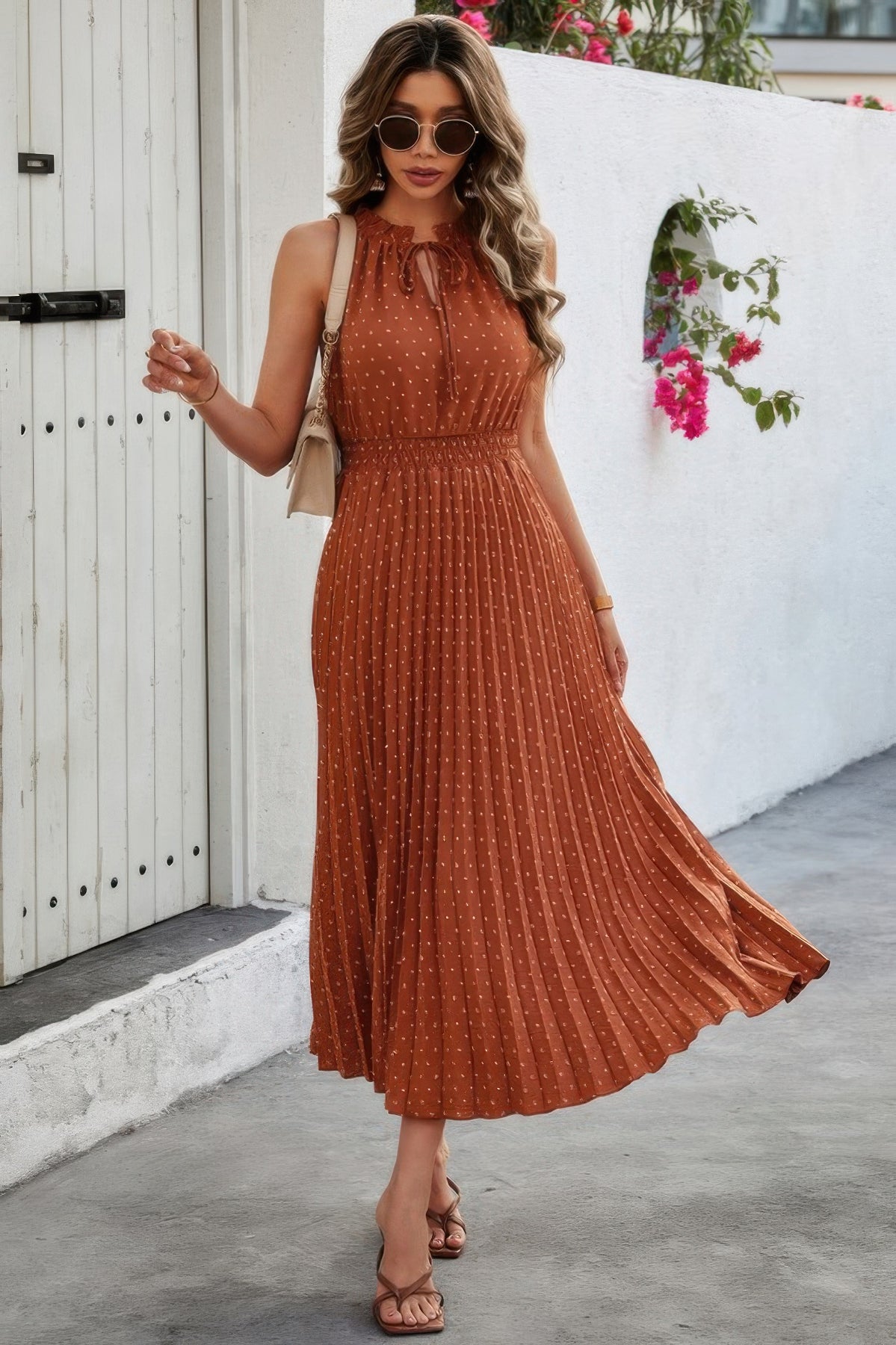 Sleeveless Dot Print Cross Fit Pleated Dress