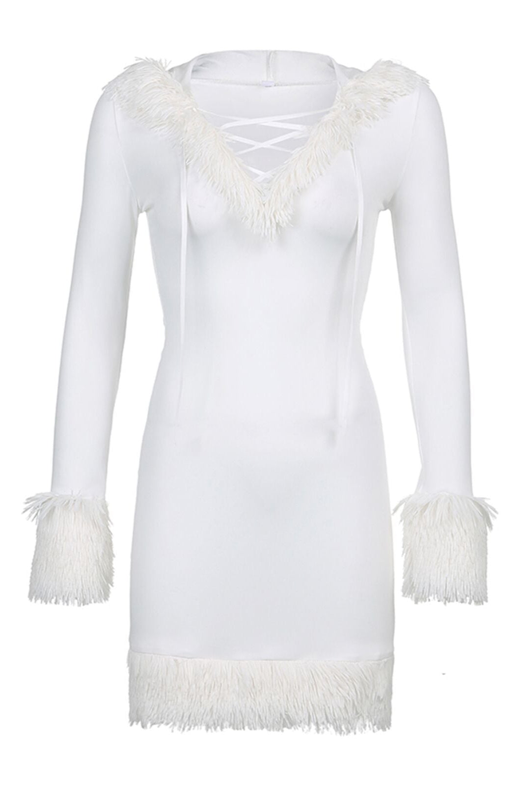 White Fur Lace-Up Hooded Dress Sexy Costume