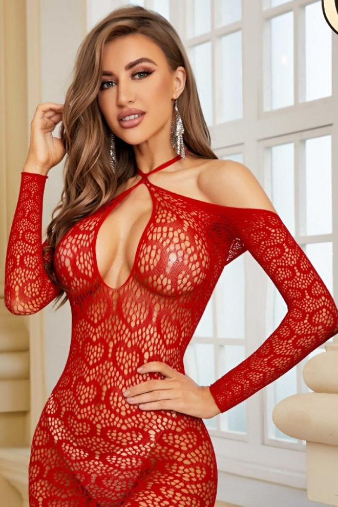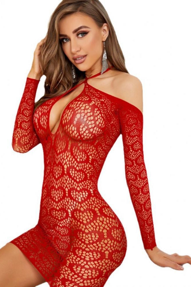 Red Stretchy Netted Halter Long Sleeve Sexy Mini Dress