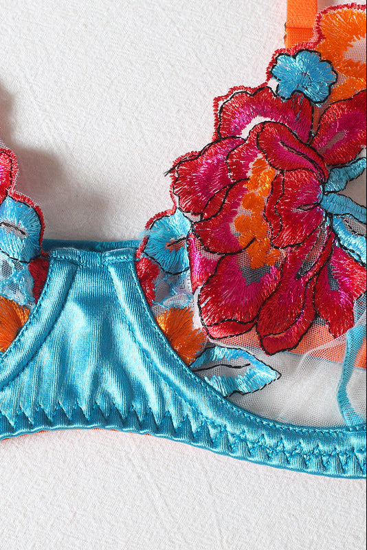 Blue Multi Flower Embroidered Lace Bra Thong Garter Belt 3Pc Lingerie Set