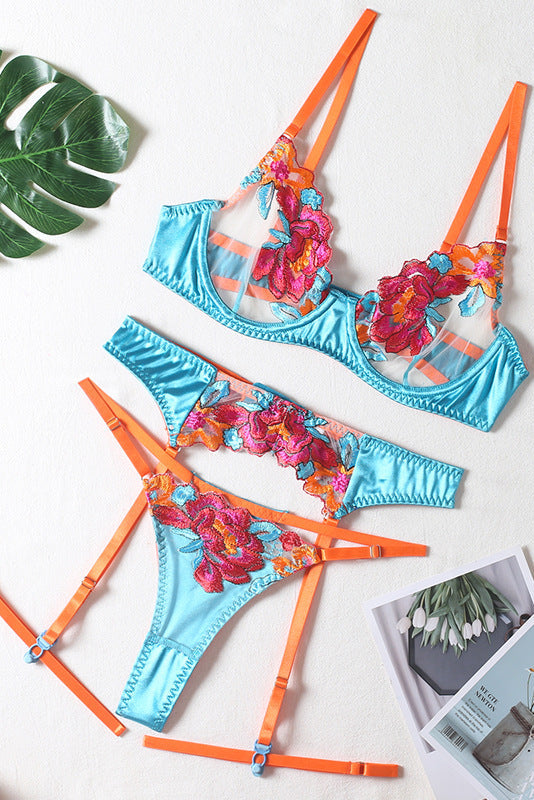 Elevate your intimate wardrobe with this stunning three-piece lingerie set featuring delicate multi-flower embroidery on luxurious lace. The coordinated bra, thong, and garter belt in rich blue create a cohesive, head-turning look that's perfect for special occasions or everyday confidence. Intricate floral detailing adds romantic charm while the quality construction ensures a comfortable, flattering fit. Mix and match with your existing pieces or wear the complete set for maximum impact.