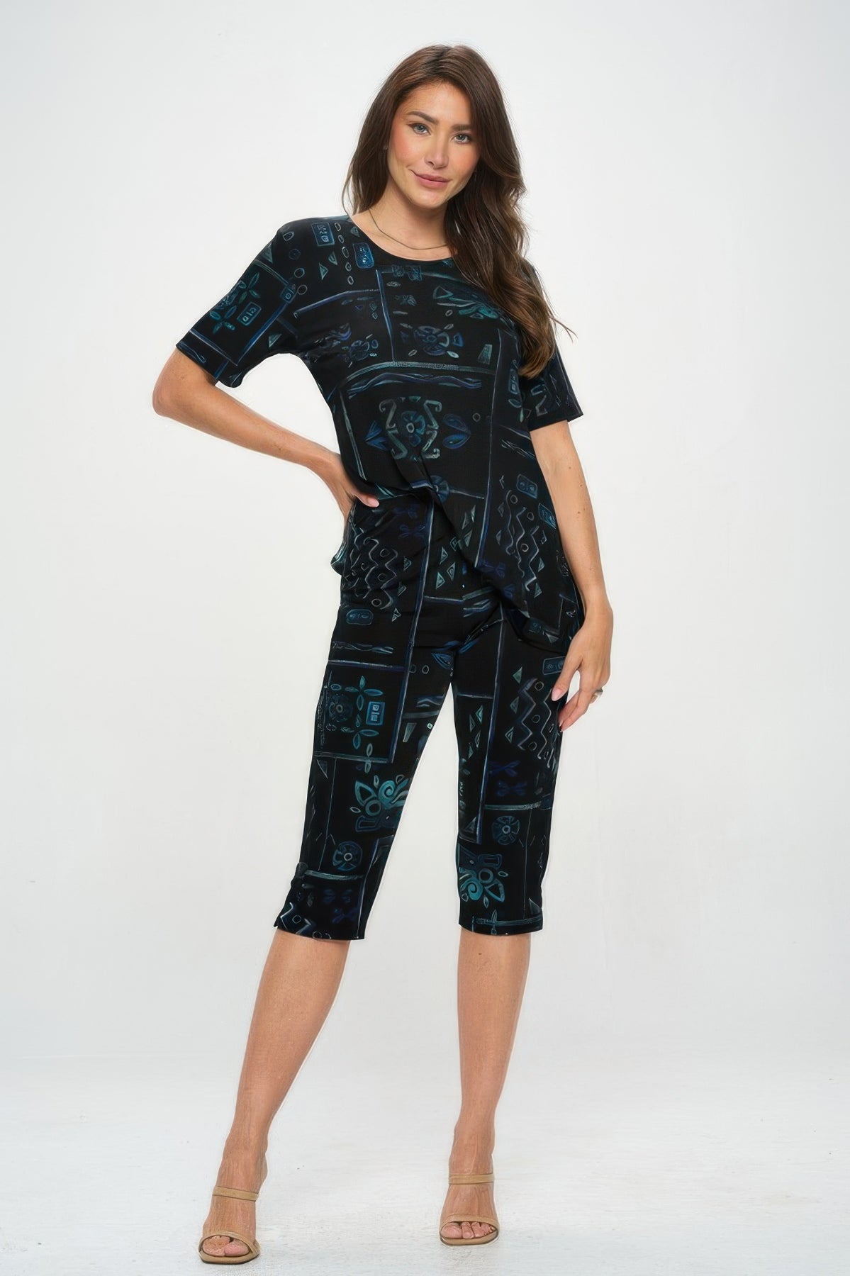 Turn heads in this chic capri set featuring a short sleeve top and elastic waist bottoms. The black base is beautifully accented by an iridescent teal and aqua print, adding a glamorous twist to a casual classic. Soft, stretchy fabric ensures comfort all day long, making this set perfect for at-home ease or stylish errands. Effortlessly coordinated, it's a standout addition to your everyday rotation.