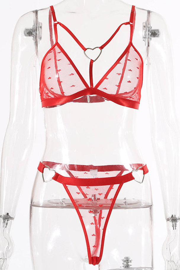 Red Heart Print Mesh Cut Out Heart Ring 2 Pc Thong Lingerie Set SF001