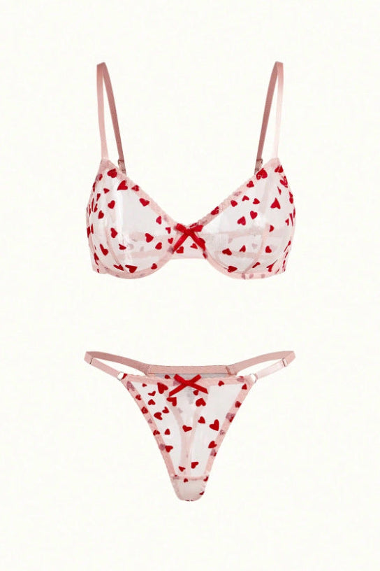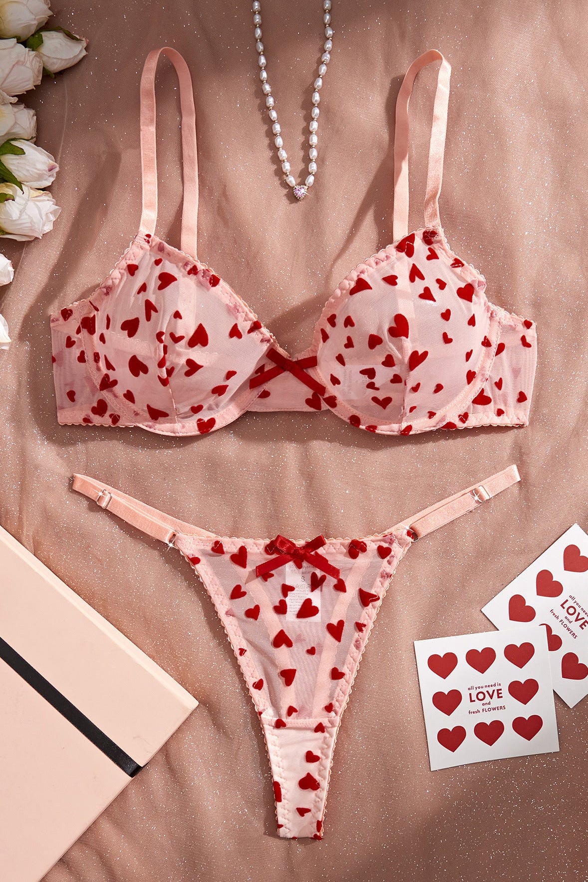 Pink Mesh Red Heart Wired Bra Thong Bow Sexy 2Pc Lingerie Set
