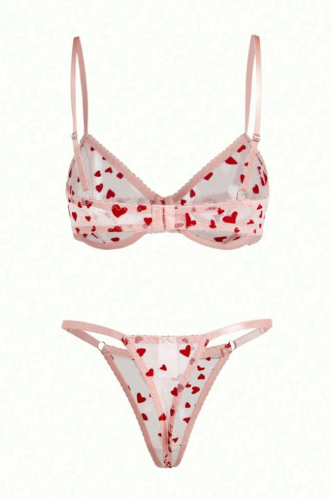 Flirt with confidence in this darling two-piece set that blends romance with edge. The pink mesh bra features delicate red heart details and underwire support for a flattering silhouette, while the matching thong completes the look with playful charm. Finished with a cute bow accent, this set strikes the perfect balance between sweet and sultry—ideal for date night or whenever you want to feel fabulous in your own skin.