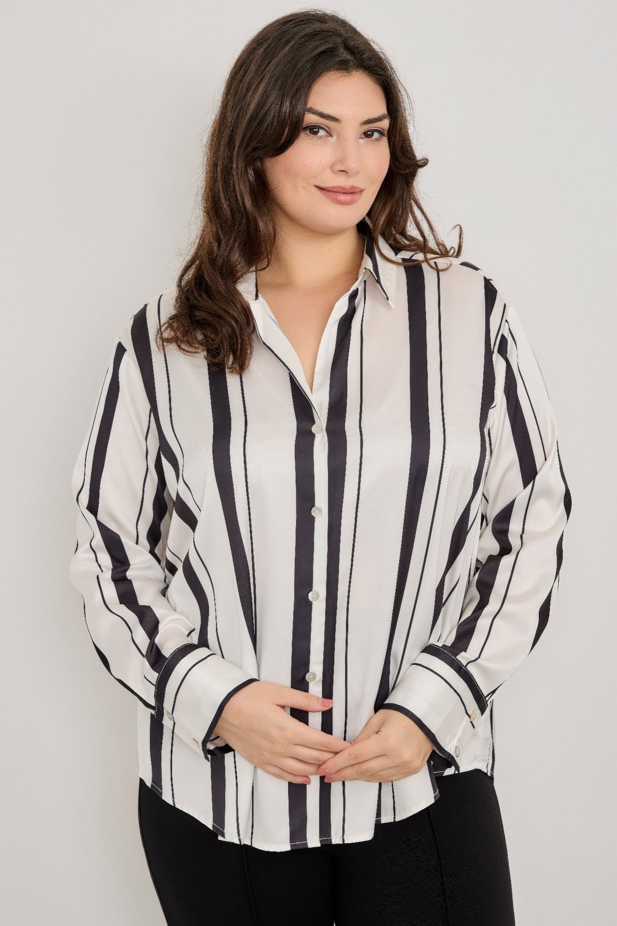 Refined and versatile, this plus size vertical stripe button-down blouse brings timeless sophistication to your everyday style. Crafted from a smooth, stretch-infused fabric blend, it offers a comfortable fit that drapes beautifully over the body. The vertical stripes elongate the silhouette for a flattering effect, while the collared neckline and button-front design add classic polish. Finished with cuffed long sleeves and a gently curved hem, this blouse transitions seamlessly from office hours to weekend outings. Effortlessly chic and endlessly wearable, it’s a must-have staple for any modern wardrobe.