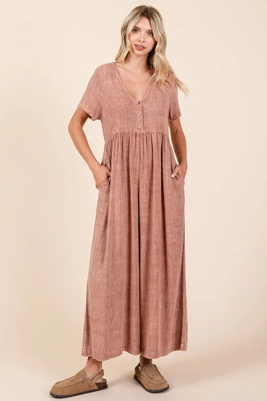 Mittoshop Mineral Wash Short Sleeve Flowy Wide Leg Jumpsuit