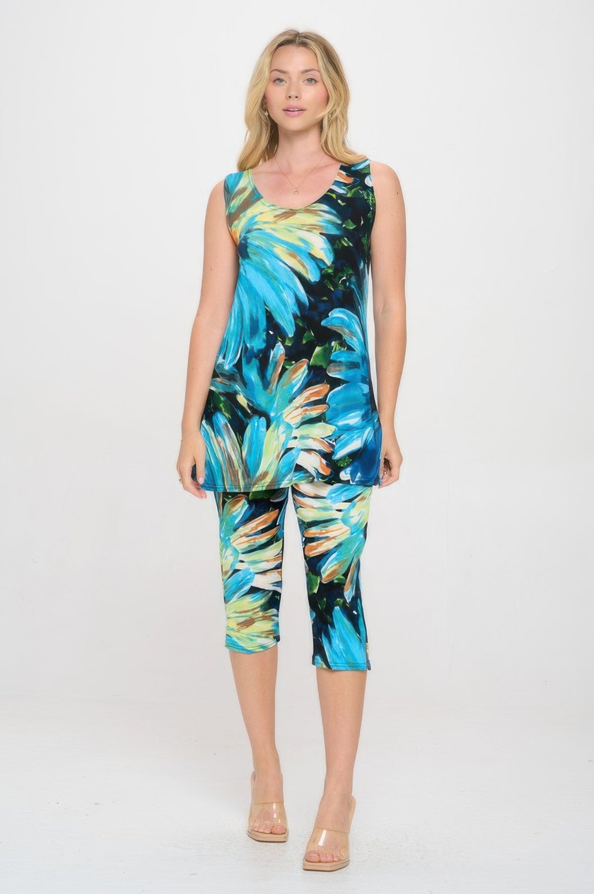 Effortlessly chic, the BNS Tank Capri Pants Set delivers coordinated style with a modern twist. The sleeveless tunic-length tank features side vents for breathability, while the matching capri pants are designed with vented hems that add movement and ease. Crafted from a silky stretch fabric, this wrinkle-resistant set is perfect for busy days or relaxed weekends. A versatile choice that keeps you comfortable and polished on the go.