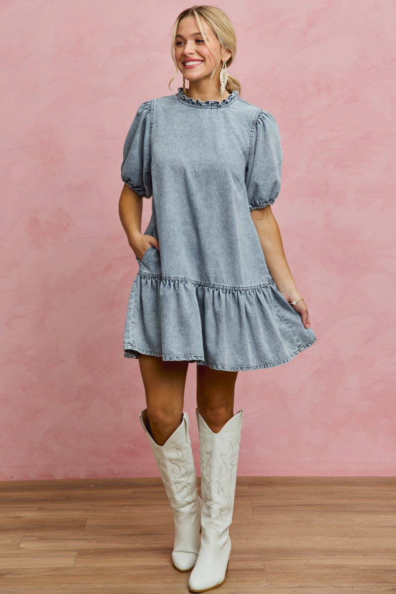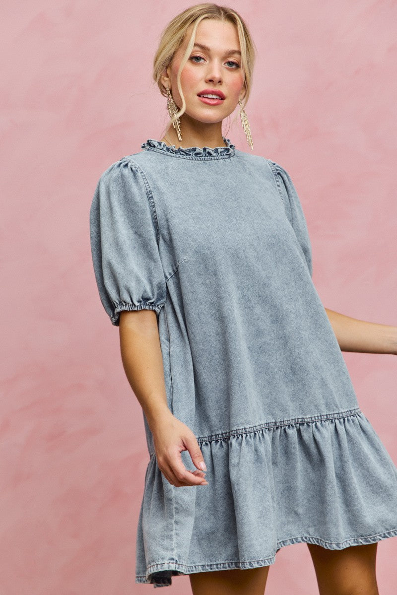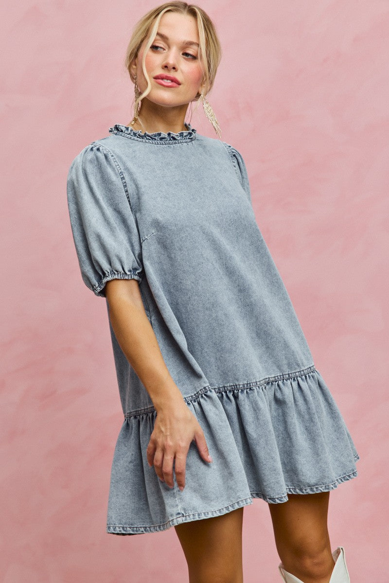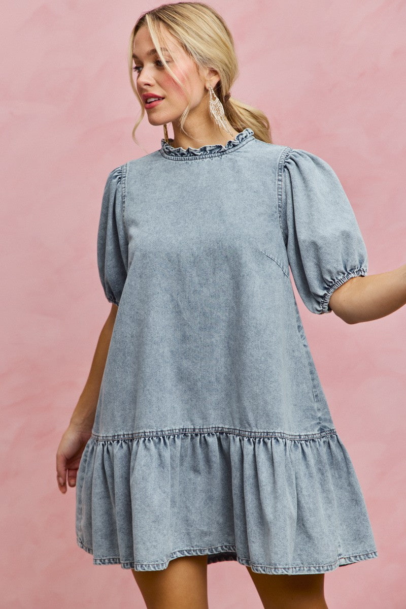 SO ME Denim Short Sleeves Mini Tiered Dress