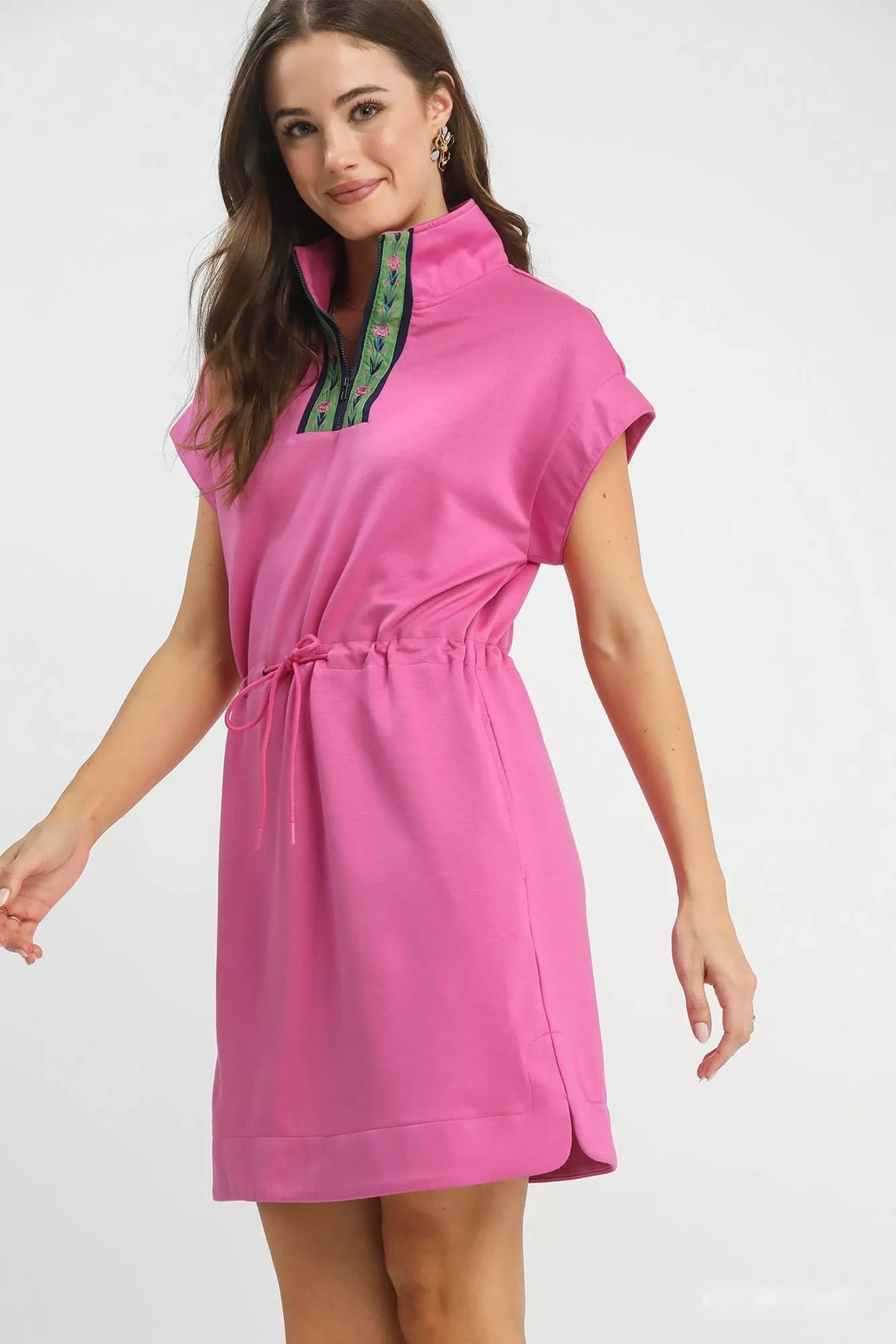 This dolman sleeve zip detail dress is made from soft and lightweight woven fabric for a comfortable fit. The dolman short sleeves add a stylish and relaxed touch to the dress. The front zip neckline with embroidered trim detail gives a modern and chic look. An adjustable waist drawstring allows for a customized fit and silhouette. Unlined for a breathable feel, this dress is perfect for a casual yet trendy outfit.