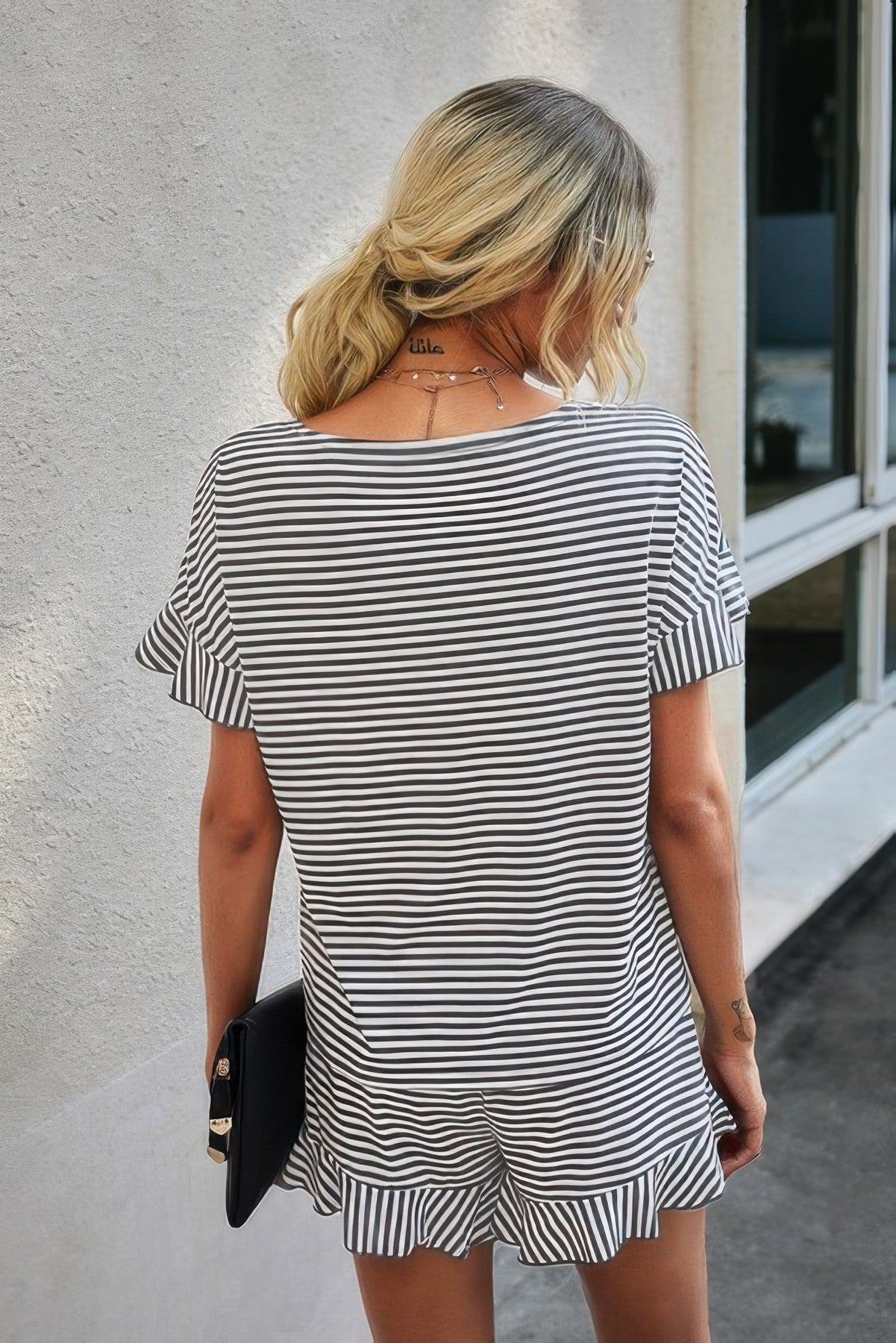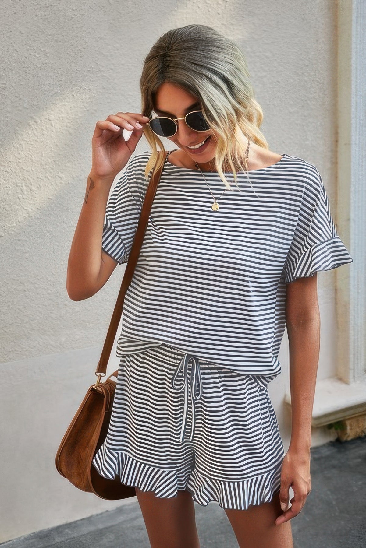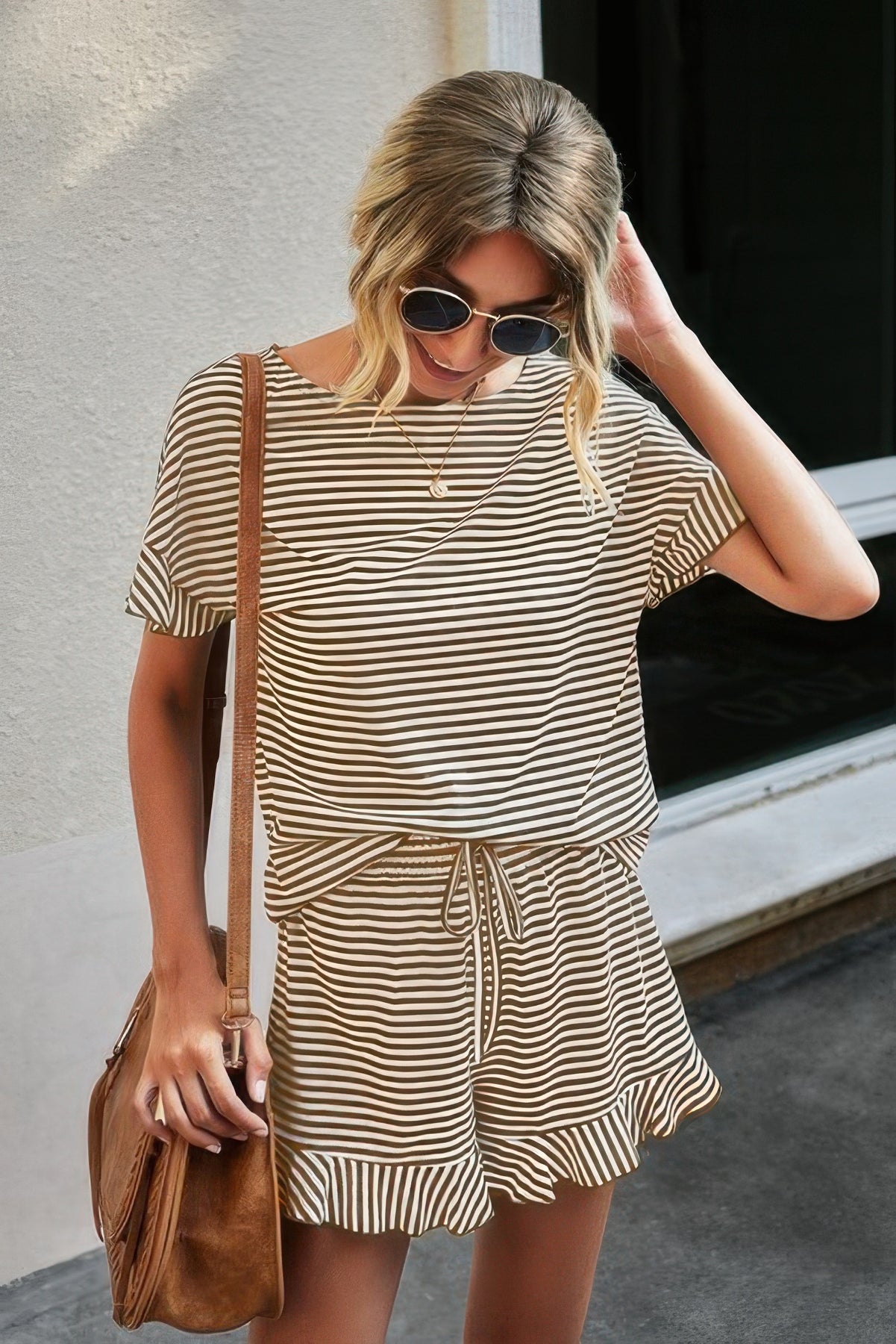 Material: 95% Polyester 5% Spandex.Features: Round Neck, Short Sleeve, Ruffle, Striped Print, Top and Short Set, CasualOccasion: Casual/Daily/Outdoor/Vacation/Holiday/School/Going Out.