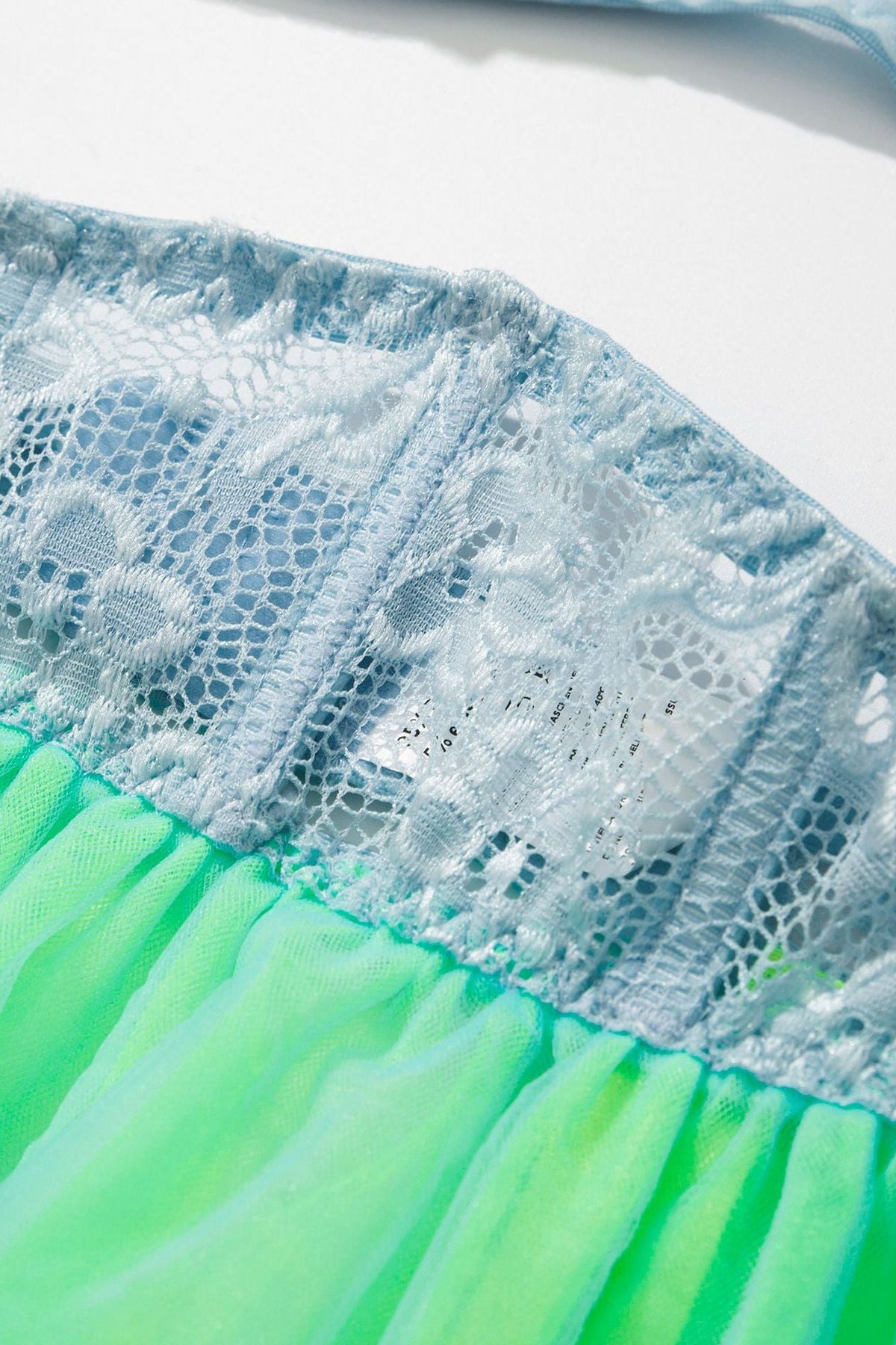 Blue Green Wired Bra Boned Corset Tutu Thong Garter Sexy 5Pc Lingerie Set