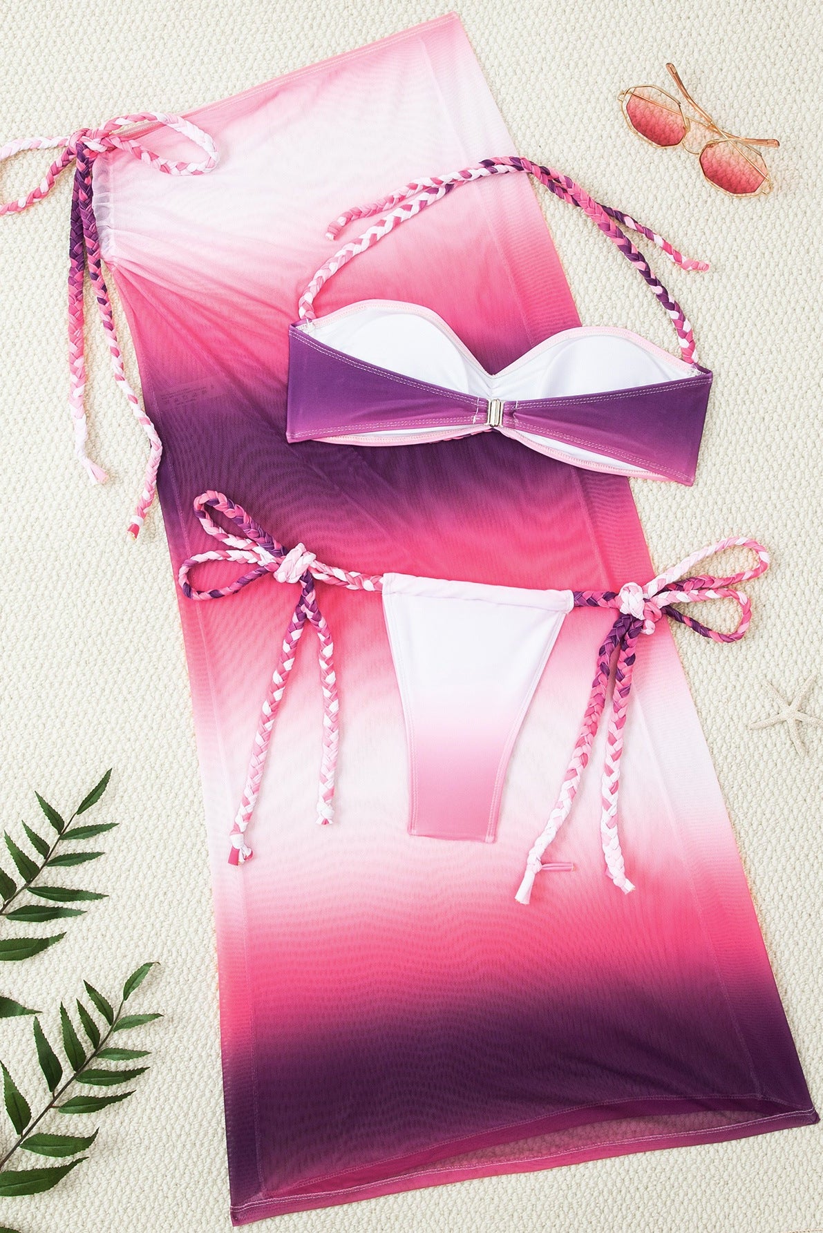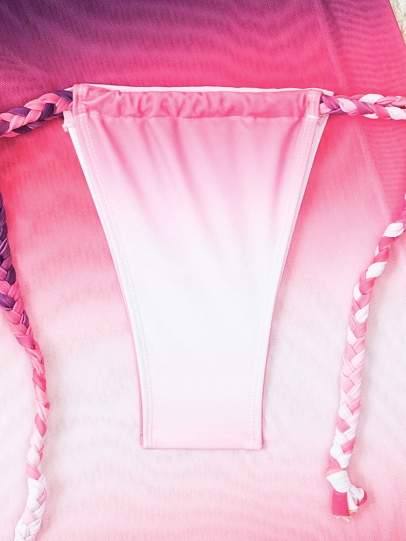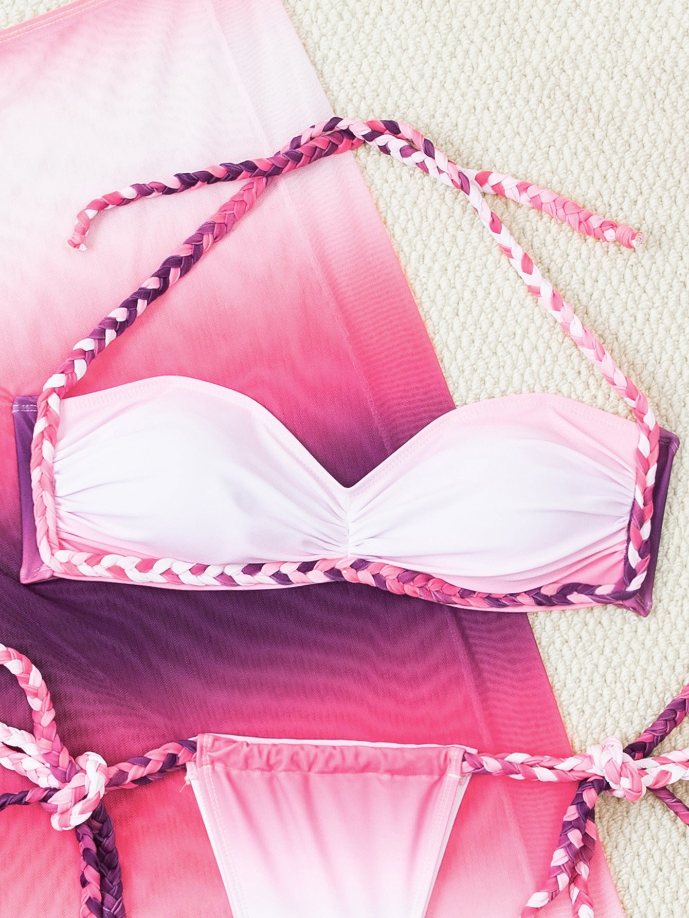 Make a statement this season with our Pink Tie Dye Braided Bandeau Halter Cheeky Maxi Mesh Skirt 3Pc Swimsuit Set. This eye-catching ensemble features a vibrant tie dye pattern in shades of pink, paired with a stylish braided bandeau halter top that offers flattering support and a trendy aesthetic. The set includes three versatile pieces: a bandeau halter bikini top, cheeky-cut bottoms, and a sheer mesh maxi skirt cover-up that adds an effortless, beachy vibe. The braided detailing on the halter strap elevates the design, while the mesh skirt provides coverage and dimension to your poolside look. Perfect for beach days, resort vacations, or lounging by the pool, this three-piece set gives you multiple styling options in one purchase. The tie dye pattern ensures you'll stand out while the quality construction keeps everything secure and comfortable all day long.