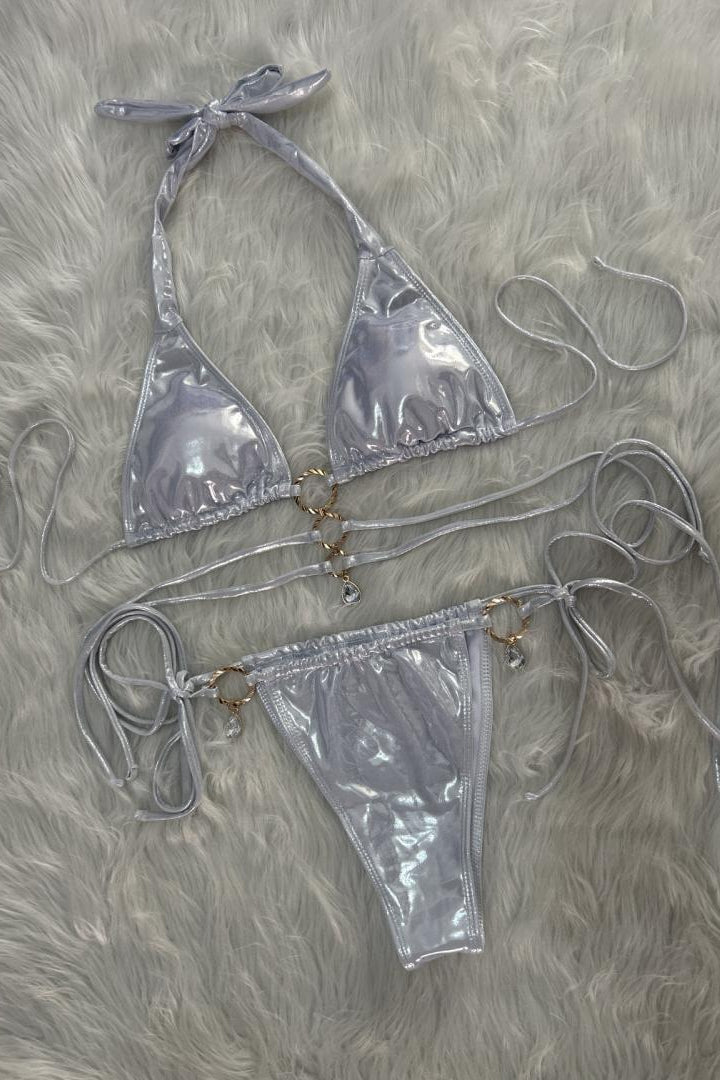 Silver Metallic 3 Straps Dangling Rhinestone Gem Sexy 2Pc Swimsuit Bikini