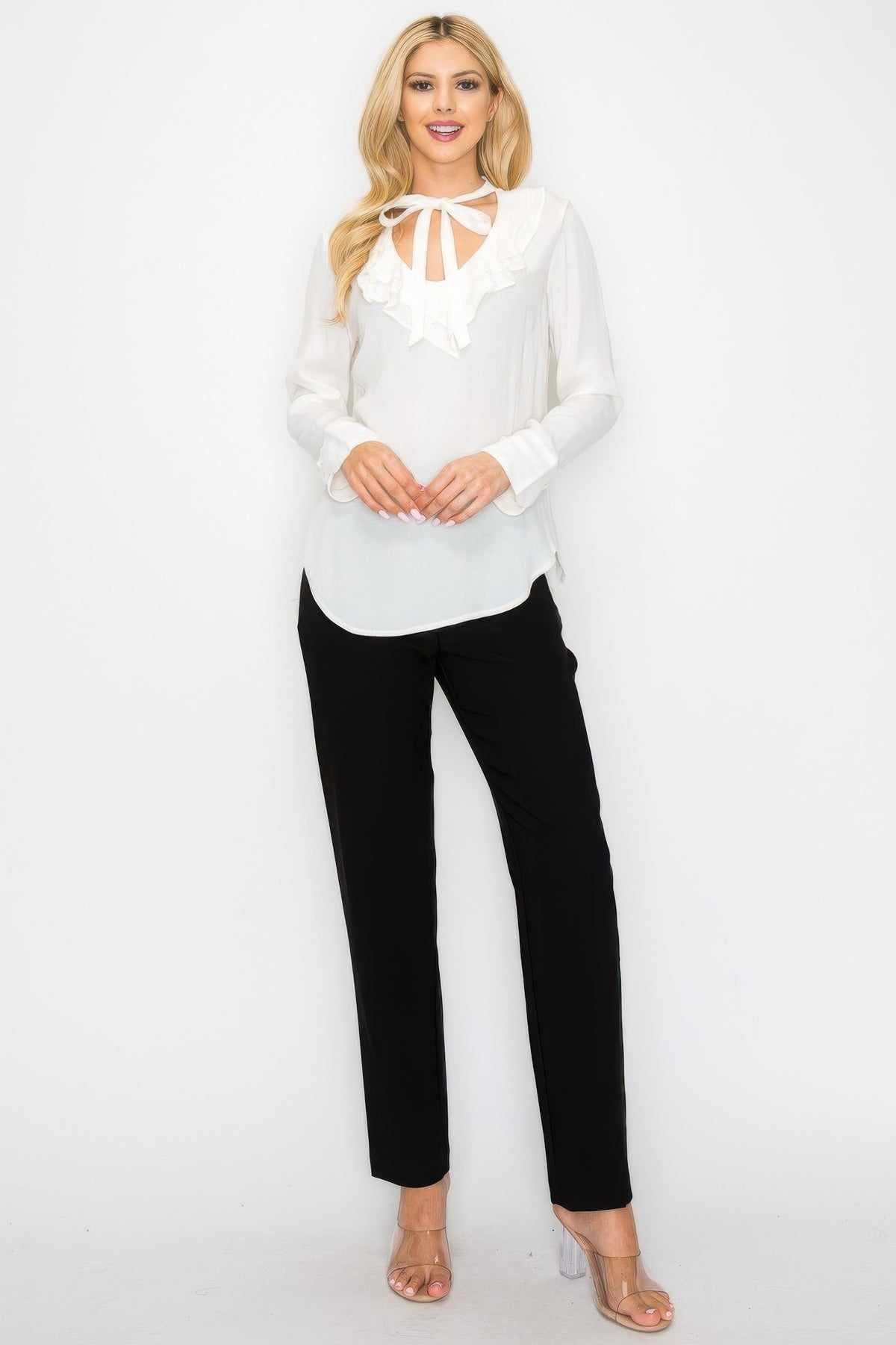 Feminine and timeless, this ruffle detail front tie V-neck long sleeve blouse adds a touch of effortless elegance to any outfit. Made from a lightweight blend of viscose and rayon, it offers a soft, airy feel with beautiful drape and movement. The V-neckline features delicate ruffle accents and a dainty front tie for a romantic touch, while the long sleeves lend a polished finish. Perfect for pairing with skirts, jeans, or trousers, this blouse transitions seamlessly from day to night.