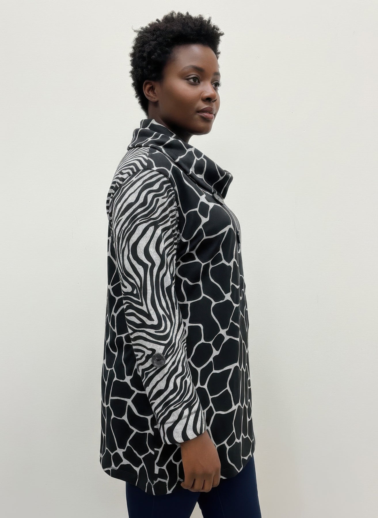 • Cowl neckline with decorative button accents