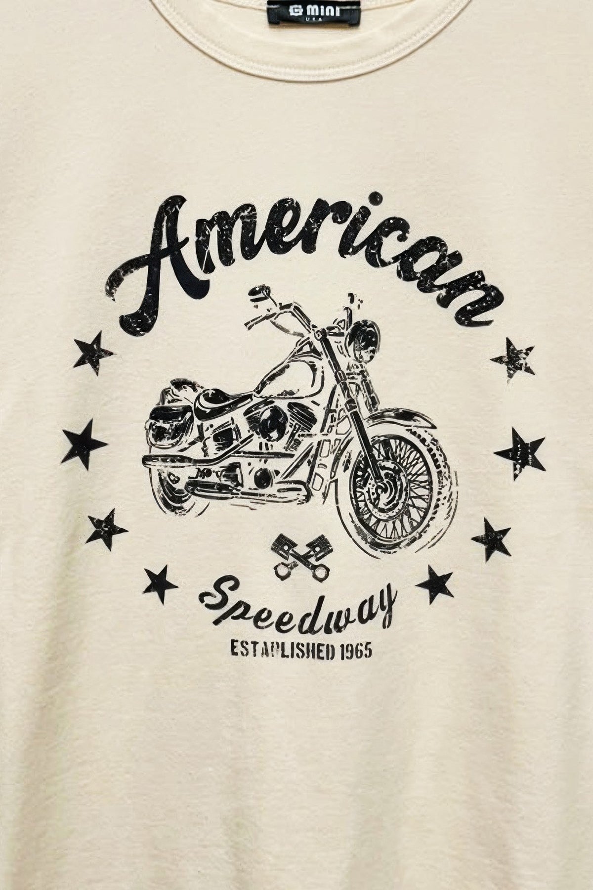 The American Motorcycle Cotton Boxy Top fuses vintage grit with laid-back comfort. Designed with a bold screen-printed motorcycle graphic, this tee channels timeless Americana style. Its boxy silhouette offers a relaxed, easy fit, perfect for pairing with denim or layering under a jacket. Made from a soft cotton-spandex blend, it provides light stretch for everyday ease. Whether you're hitting the road or kicking back, this top brings confident, carefree energy to your look.