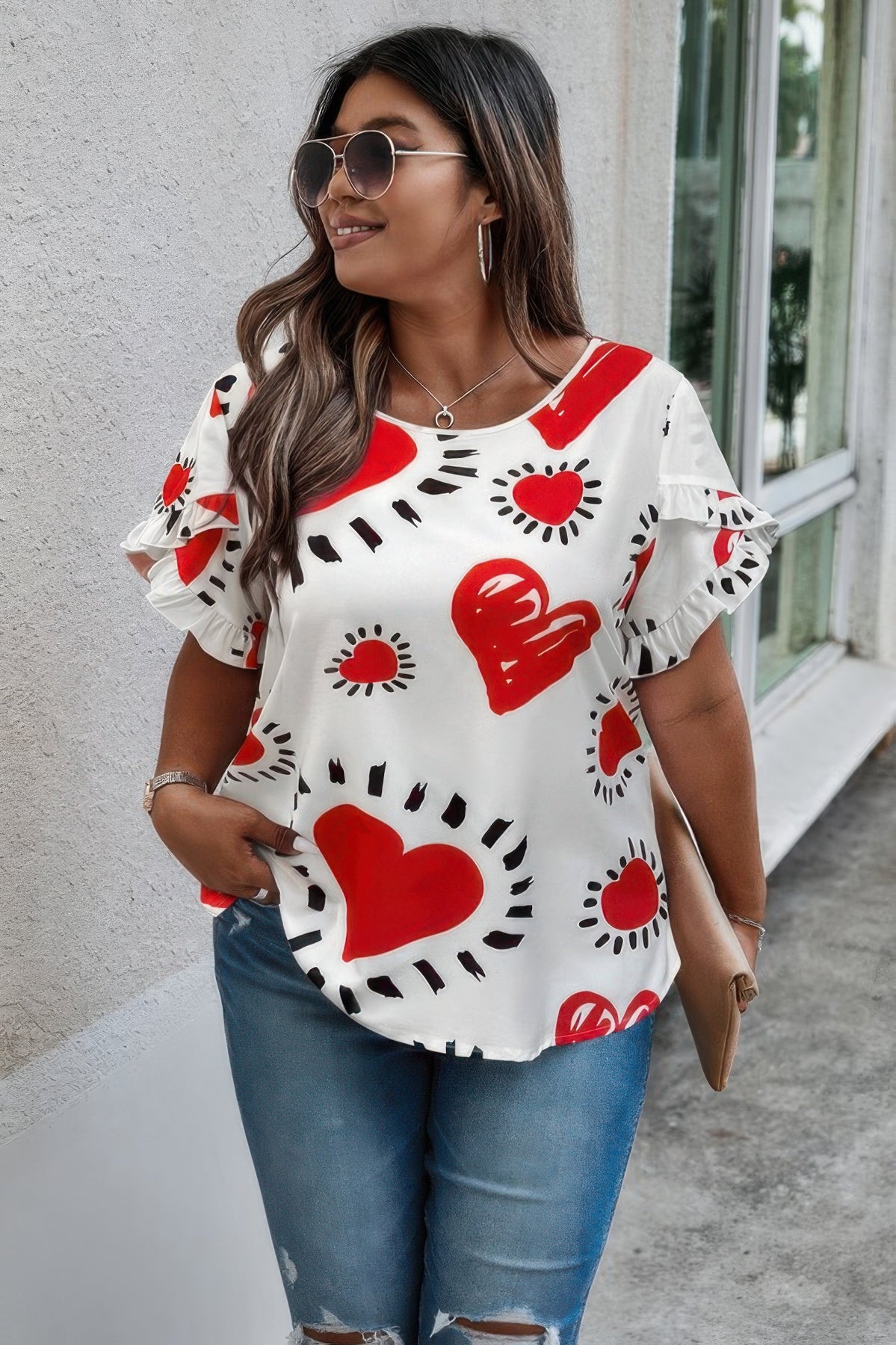 Add a playful touch to your everyday wardrobe with this charming plus size heart print shirt. Designed with flattering ruffle hem sleeves, this top effortlessly combines comfort and style. The soft, stretchy fabric ensures a comfortable fit for all-day wear, while the eye-catching heart pattern brings a fun, feminine vibe to any outfit. Perfect for casual days, weekend getaways, or laid-back outings, this versatile piece pairs beautifully with jeans, shorts, or skirts. With its relaxed fit and thoughtful design details, it's an easy choice for adding personality to your look.