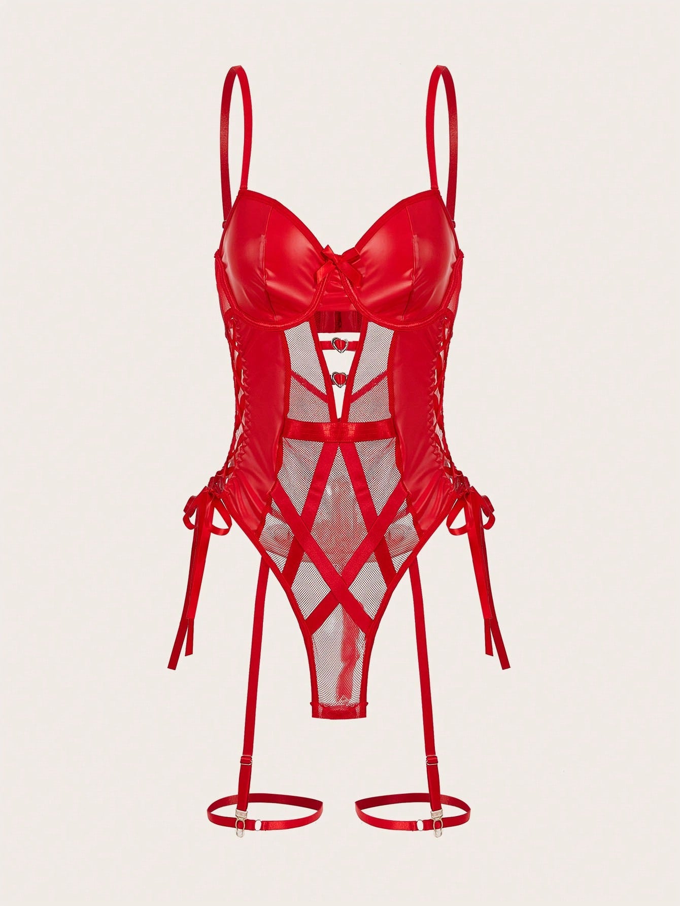 Red Faux Leather Mesh Bandage Hearts Thong Sexy Garter Lingerie Set