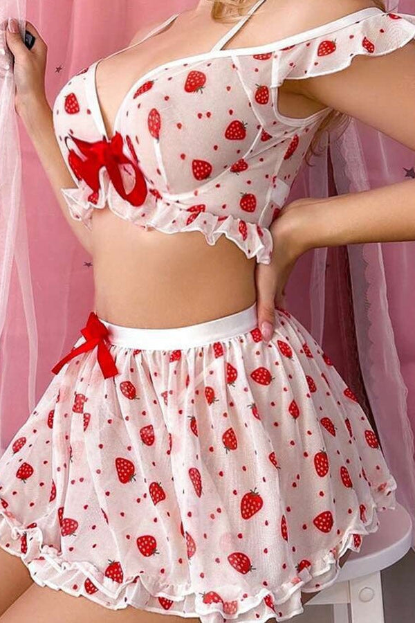 Blush-worthy elegance meets flirty fun in this two-piece lingerie set. The off-shoulder mesh top features delicate strawberry embroidery and romantic ruffles that frame your shoulders perfectly, while the coordinating shorts complete the look with matching playful details. Soft, breathable mesh keeps you comfortable all night long, whether you're looking to impress or simply treat yourself to something special. Perfect for date night or everyday confidence.