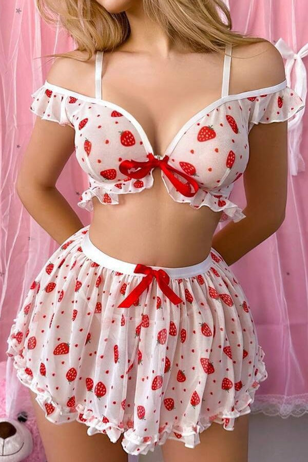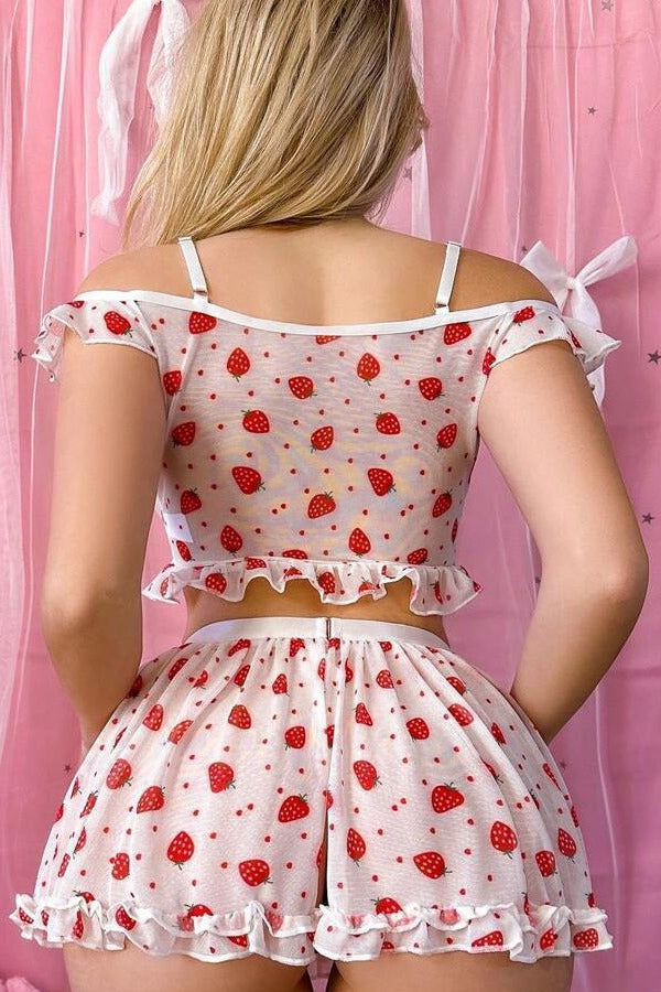 White Strawberries Mesh Ruffle Off Shoulder Top Shorts 2Pc Lingerie Set