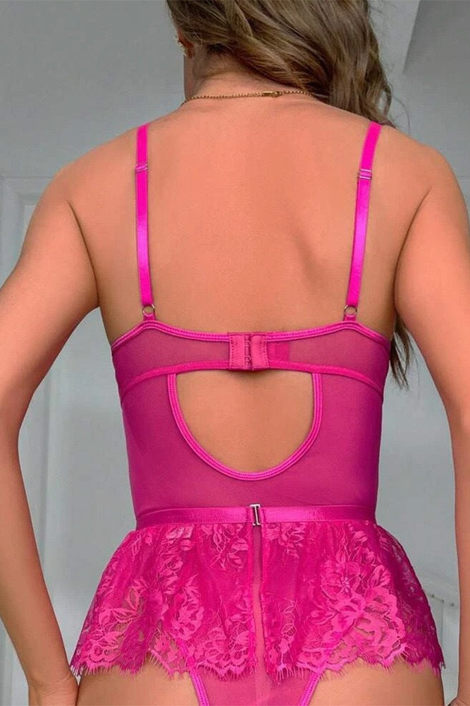Fuchsia Lace Mesh Rhinestone Heart Bodysuit Garter Skirted Belt Sexy 2Pc Lingerie Set