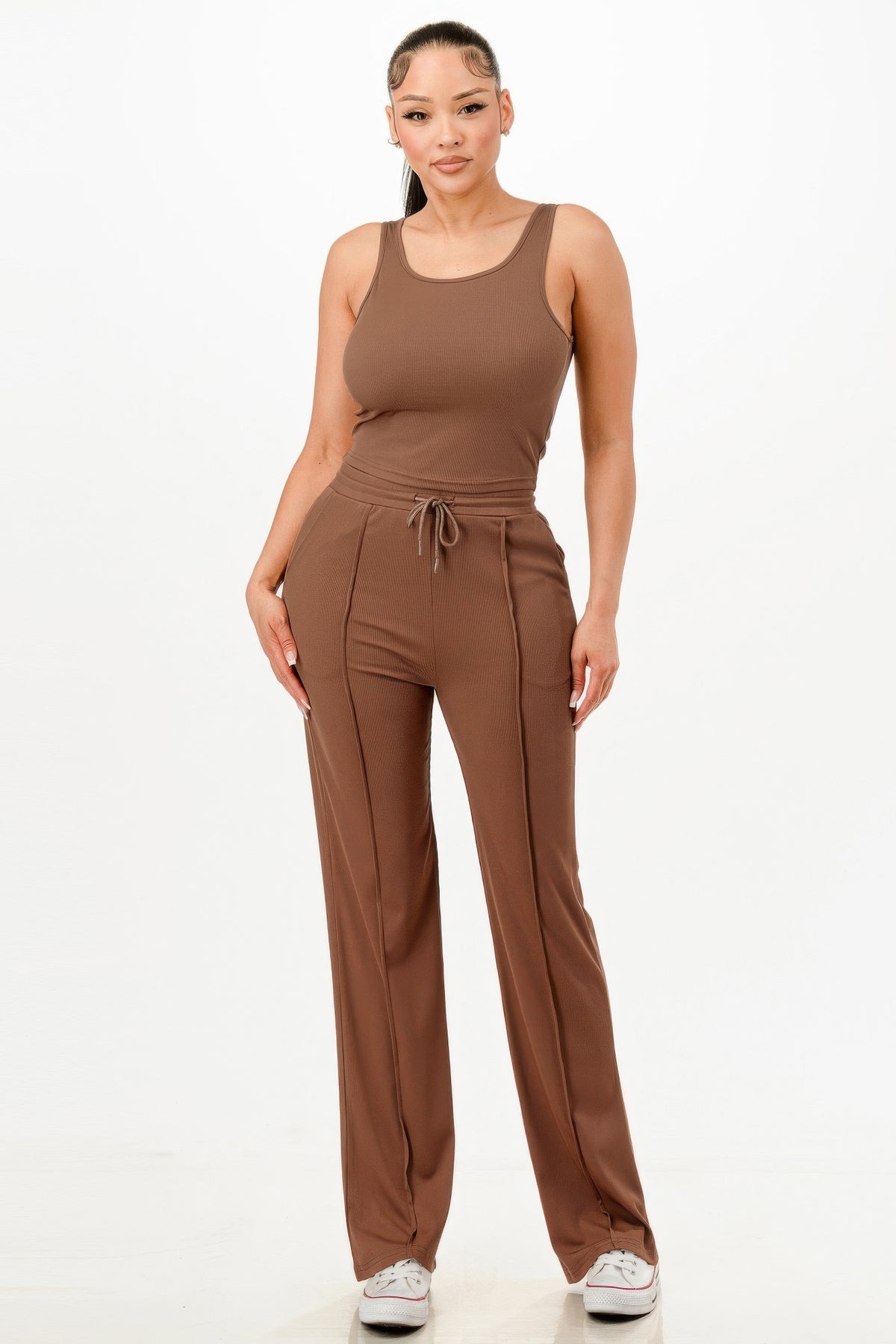 Add the Ribbed Tank Top and Pant Set in brown to your cart today and enjoy a stylish, comfortable look perfect for any laid-back occasion!