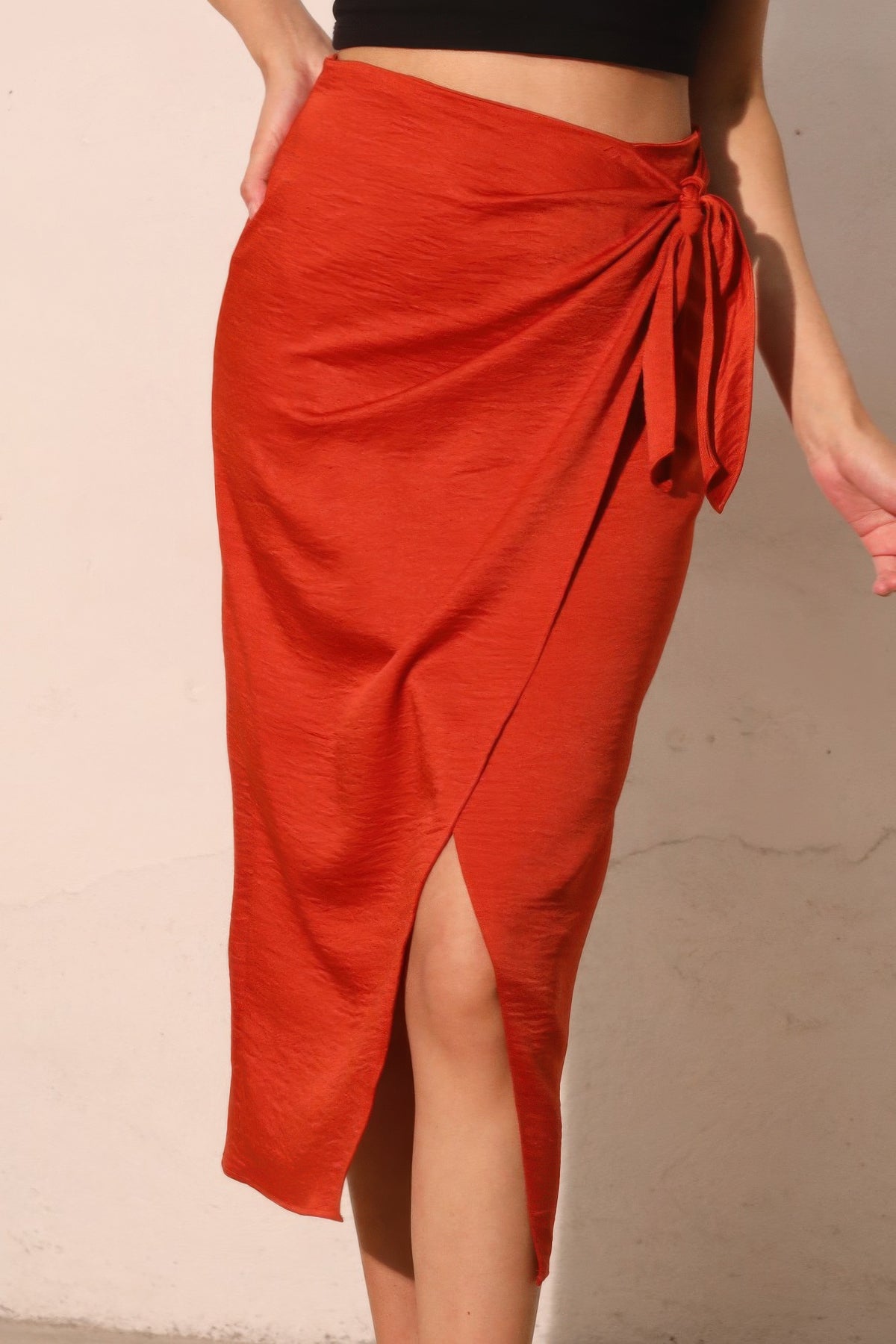 Washed Satin Crepe Side Wrap Midi Skirt