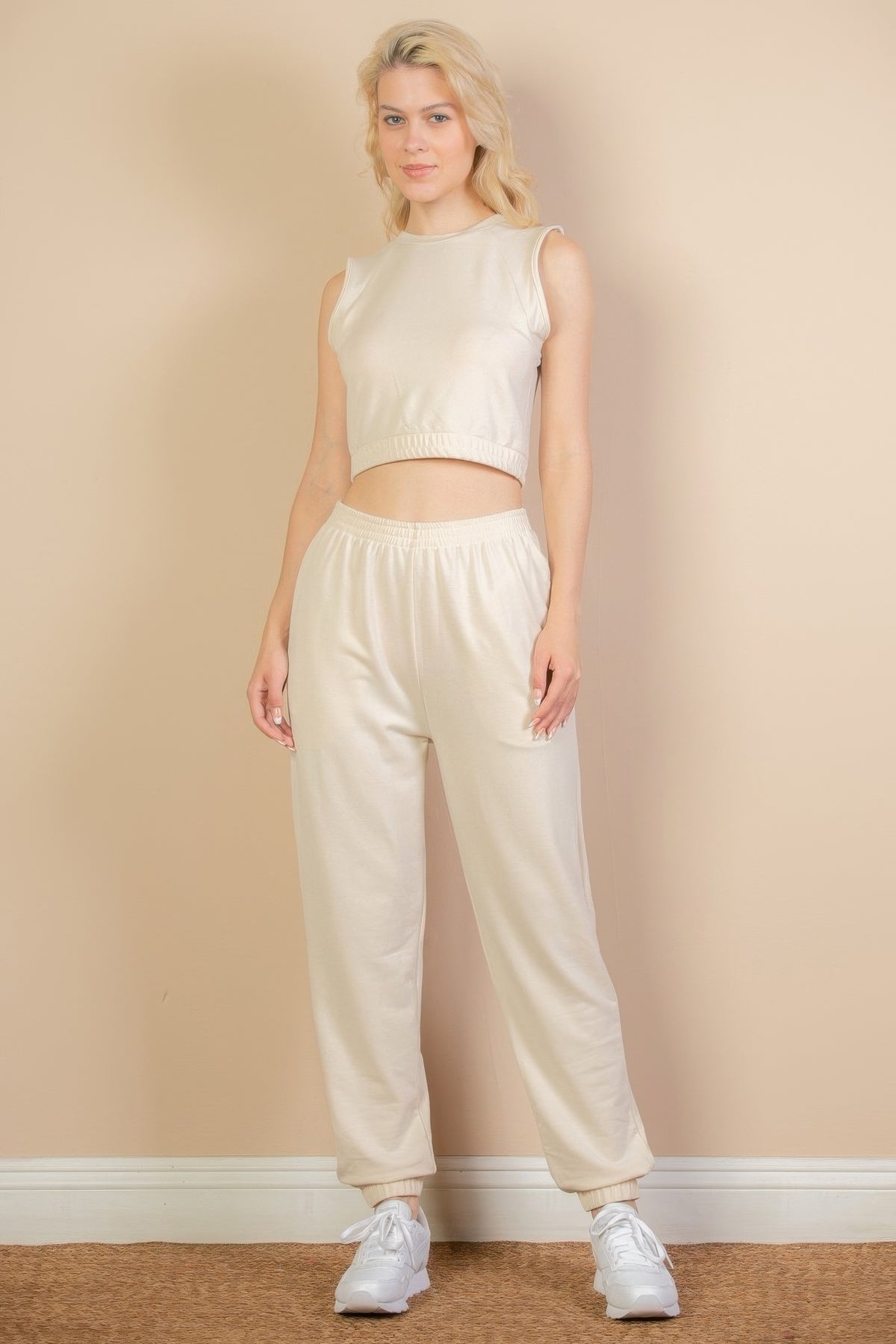 Comfortable All-Day Wear: Our French Terry Elastic Waist Tank Top & Joggers Set is crafted for all-day comfort, allowing you to move freely and relax effortlessly.
