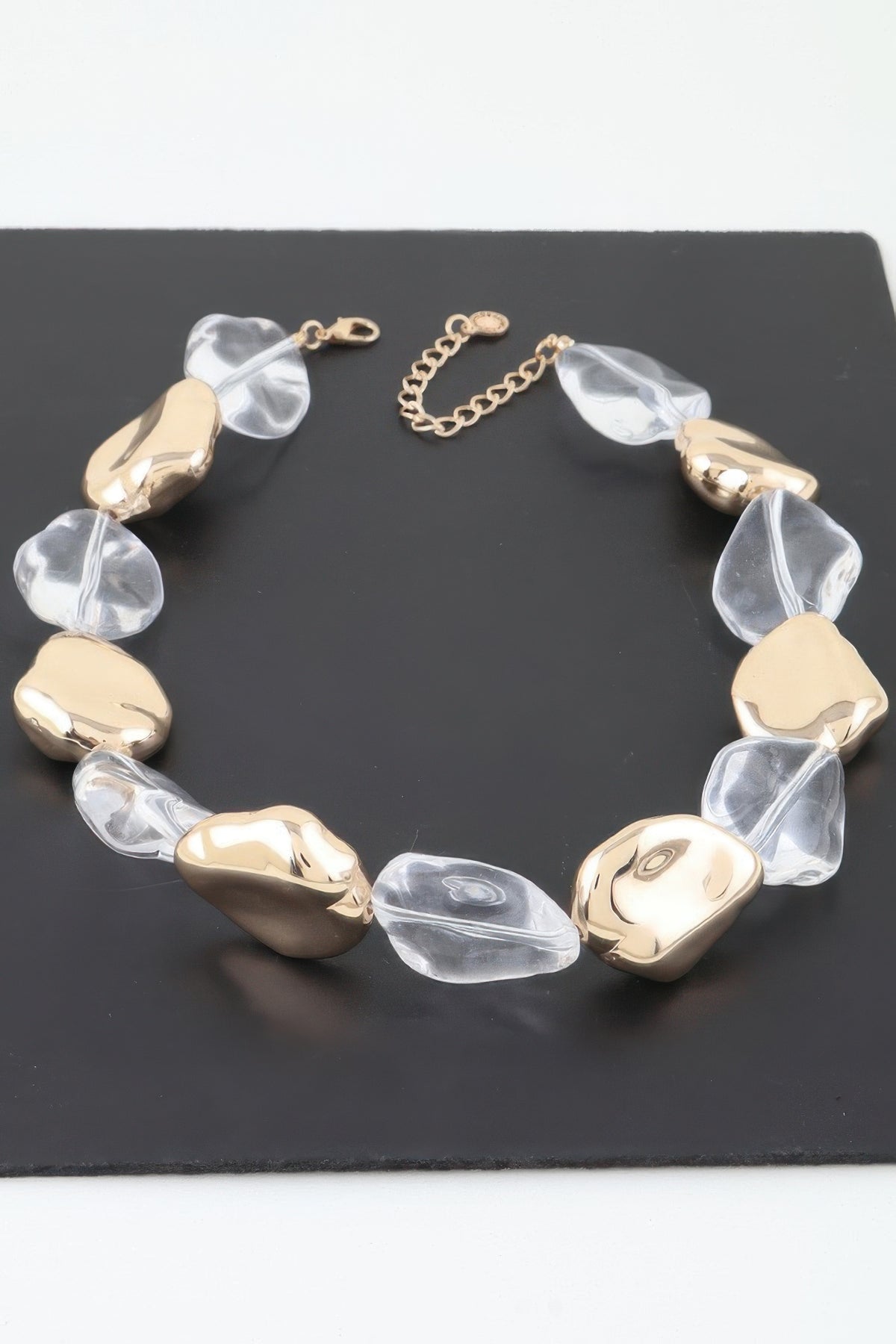 Design: The necklace showcases a beautiful arrangement of abstract stones and beads, creating a modern, artistic design. Its gold accents and clear stones add an elegant shine, making it the perfect accessory to complement any style.